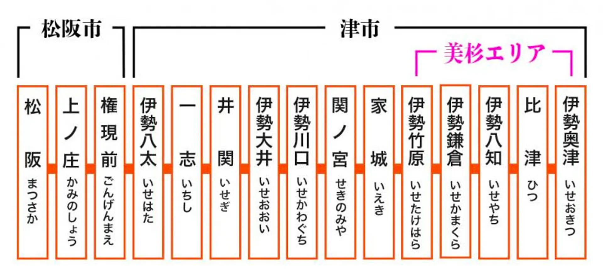 津市美杉町から松阪市まで15駅ある路線で、津市内に12駅、松阪市内に3駅あります。