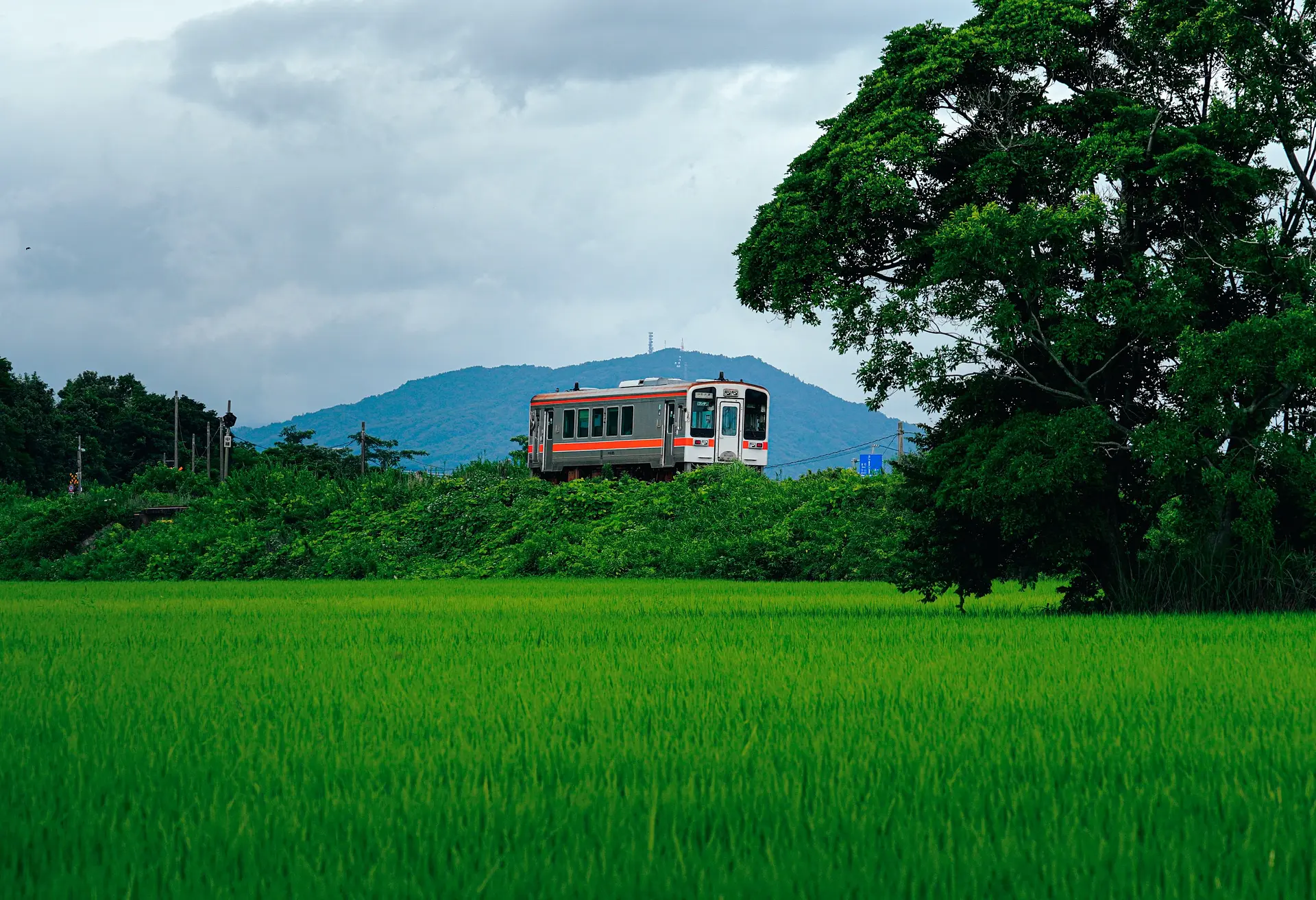 権現前駅~伊勢八太駅の沿線は田園風景が広がり、7月〜8月は草原を走るような鉄道風景が見られます。