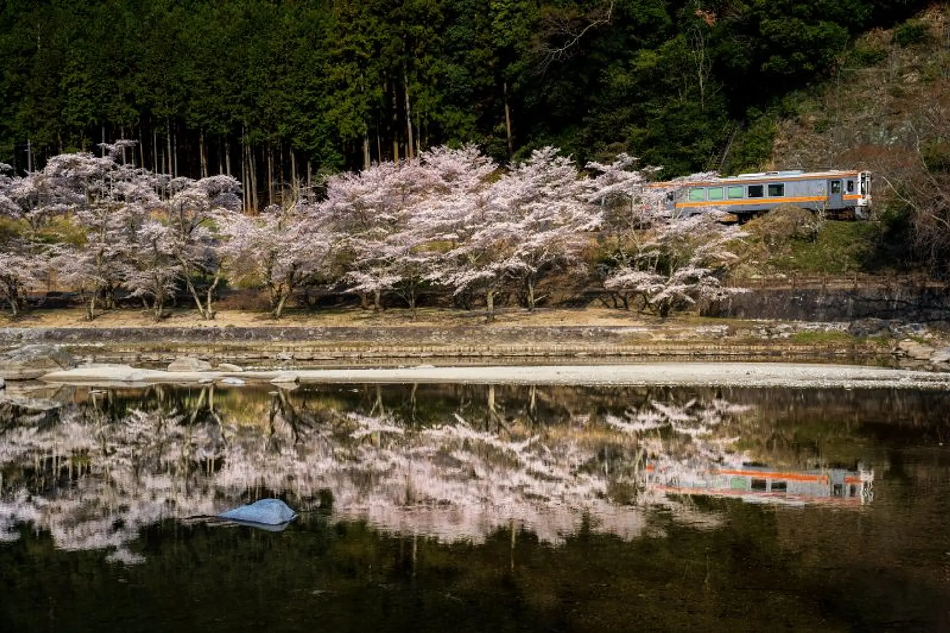水面に映る桜並木と列車は絵に描いたような美しさ。雲出川で川遊びやキャンプができる真見河川公園、リバーパーク真見の桜並木と列車を撮影した1枚です。