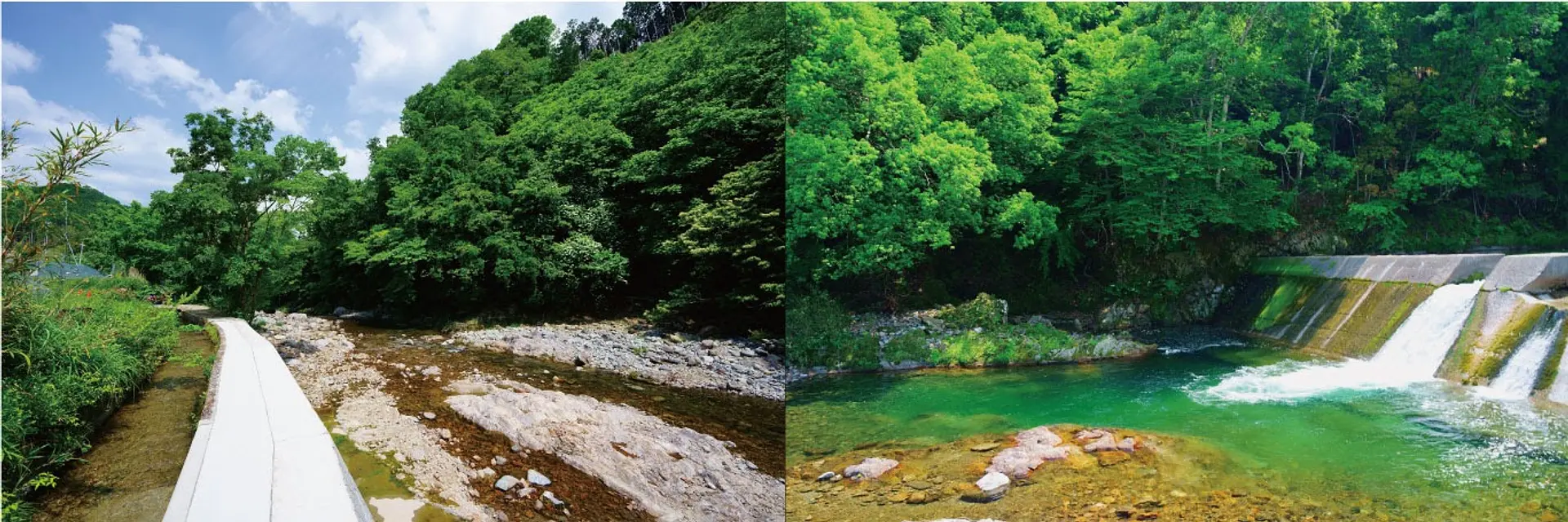 伊勢本街道を散策すると、川のせせらぎが聞こえてきました。音を頼りに道を進むと、エメラルドグリーンに輝く美しい川を発見!