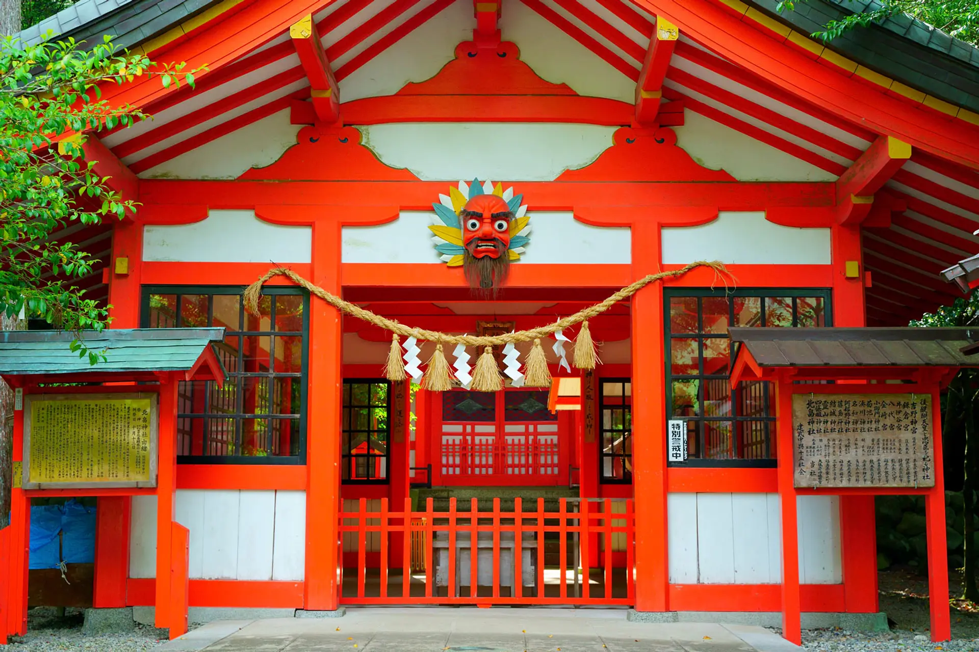 伊勢奥津駅から自転車で30分ほど移動して北畠神社に到着。境内に入ってすぐ、朱色が美しい社殿が見えてきました。まずはここで参拝をして、旅の安全祈願を行います。