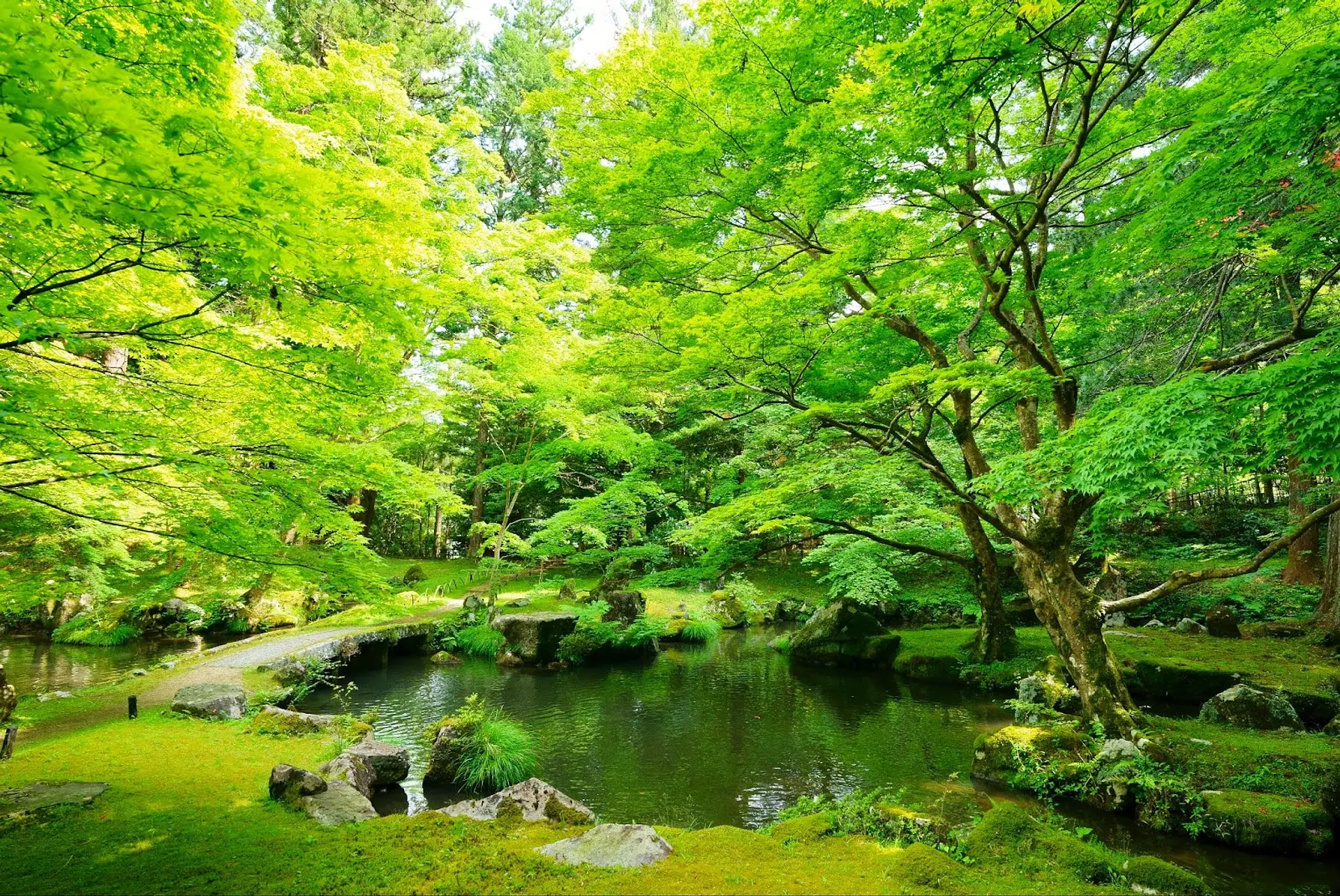 ふがまる 訪れたのが6月だったので、庭園には緑美しい光景が広がっていました。11月は真っ赤に色づく紅葉を観賞できます。