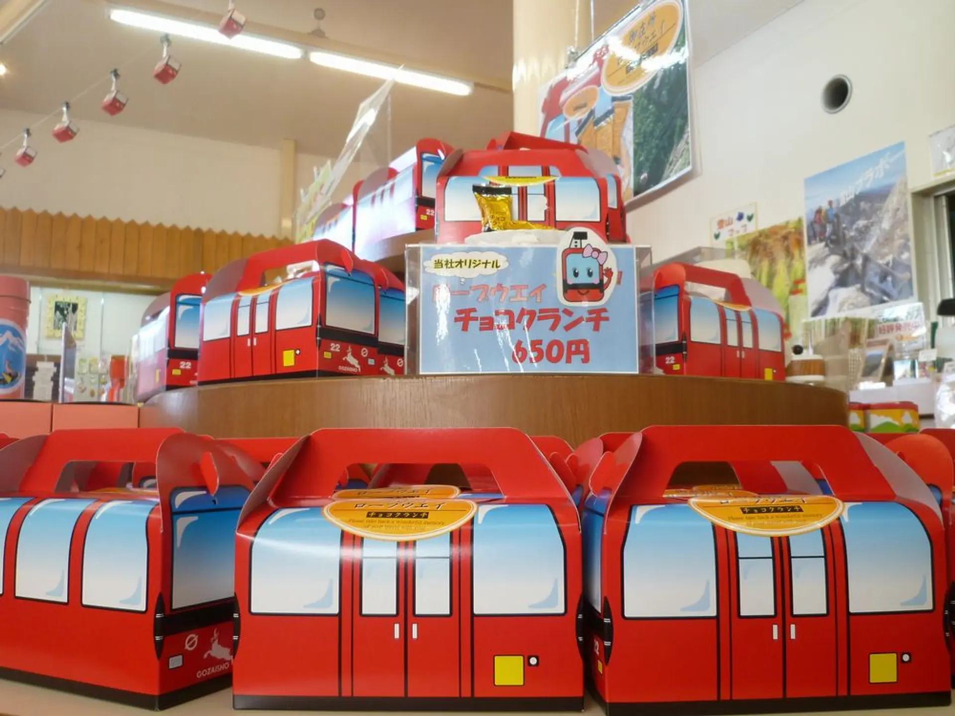 そして、今度は下りの空中散歩。上りとは違う景色を楽しんで、麓の駅に到着。ロープウエイが吊り下げられたおみやげコーナーを物色し、ロープウエイの形をしたチョコクランチ(650円)を購入しました。