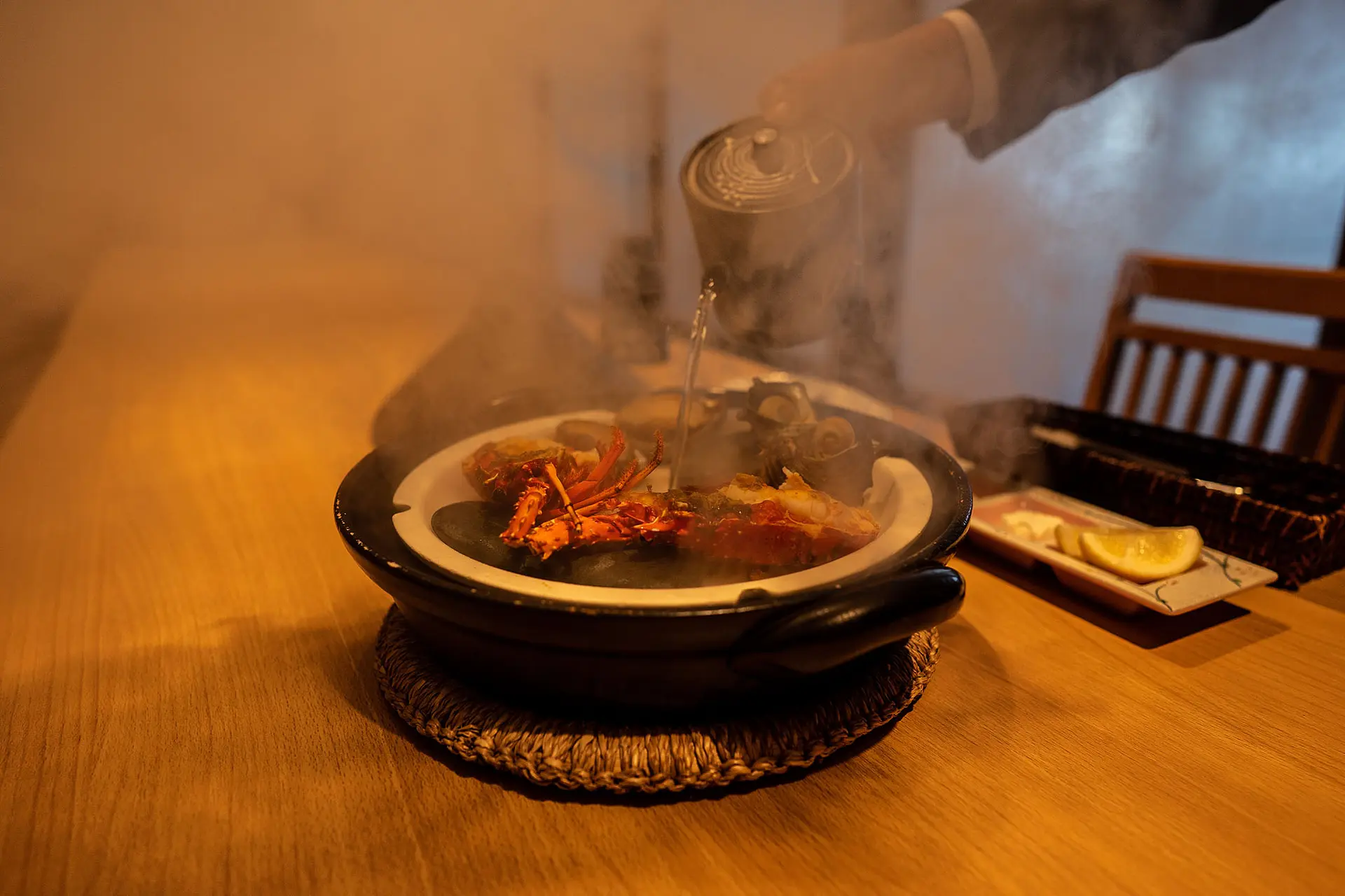 料理が運ばれてくると、熱湯をかけてその場で蒸してくれます。出てくる湯気の迫力や香りでワクワク感と食欲が最高潮に!