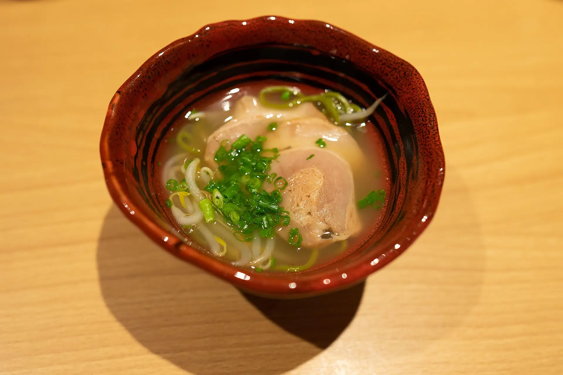 黒胡椒の効いたスープに塩ダレ、チャーシュー、ネギ、もやしが入っていて、あっさりめの味付けにピリッとした風味がほどよく調和しています。