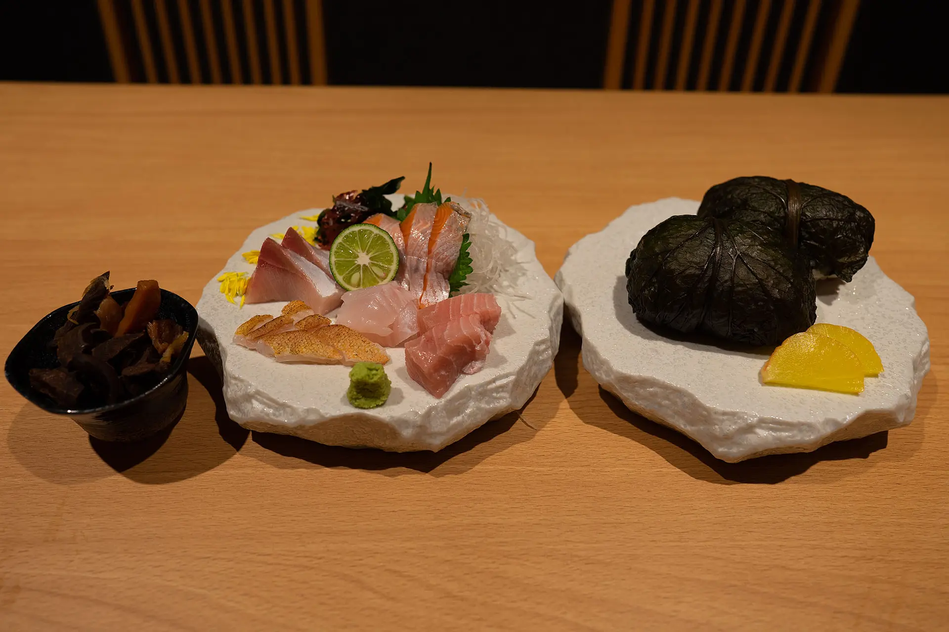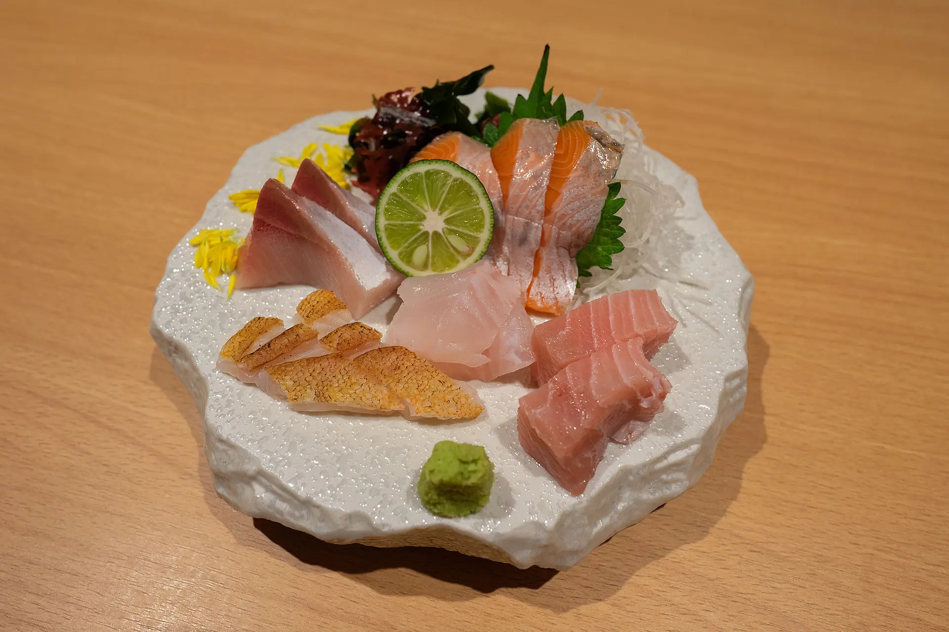 新鮮な魚のお造り。今回は、本マグロ・アカハタ・マハタ・ブリ・アマゴをいただきました。