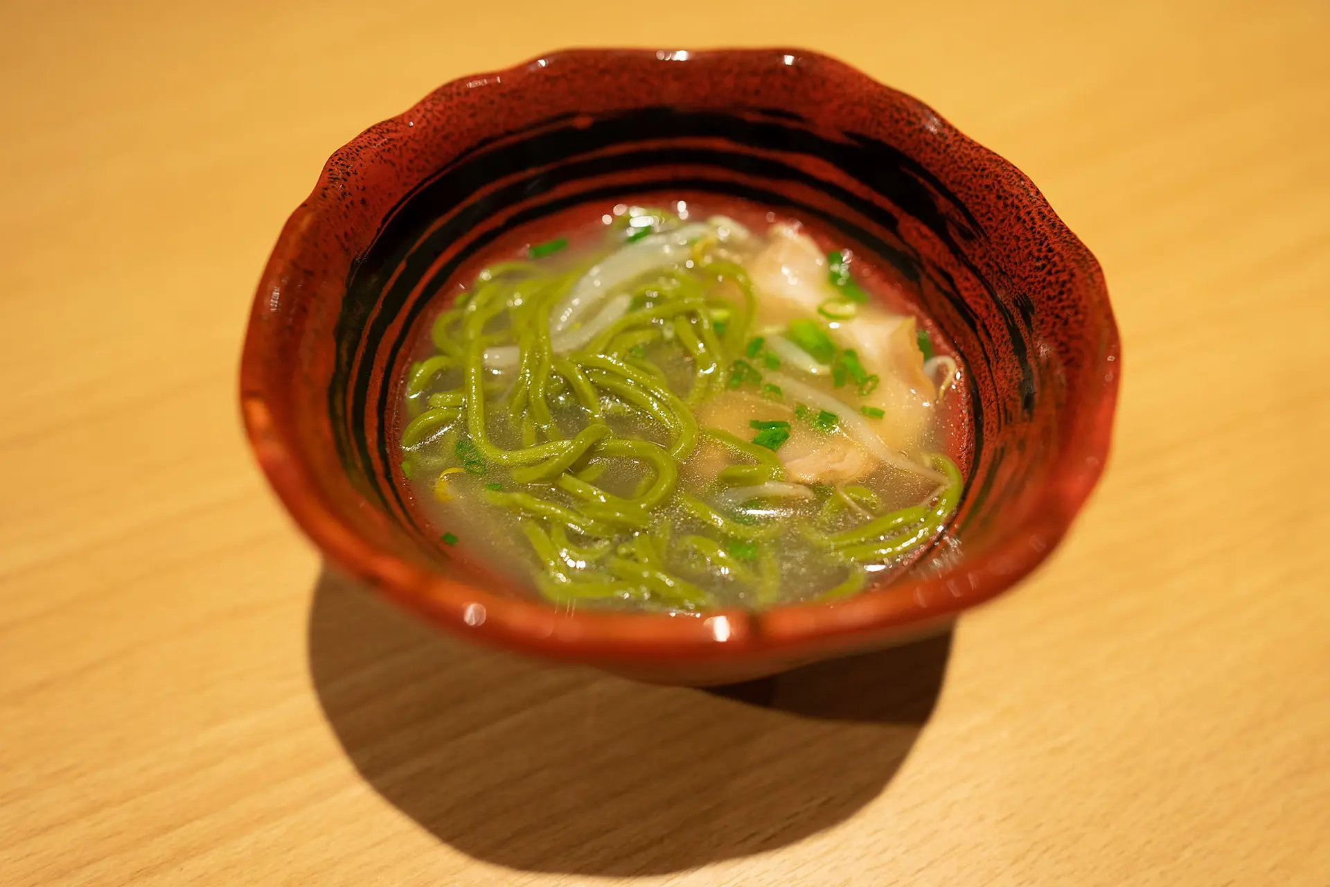 麺は、明日葉をこねて作られていて緑色なのが特徴的。しっかりしたコシのある食感です。