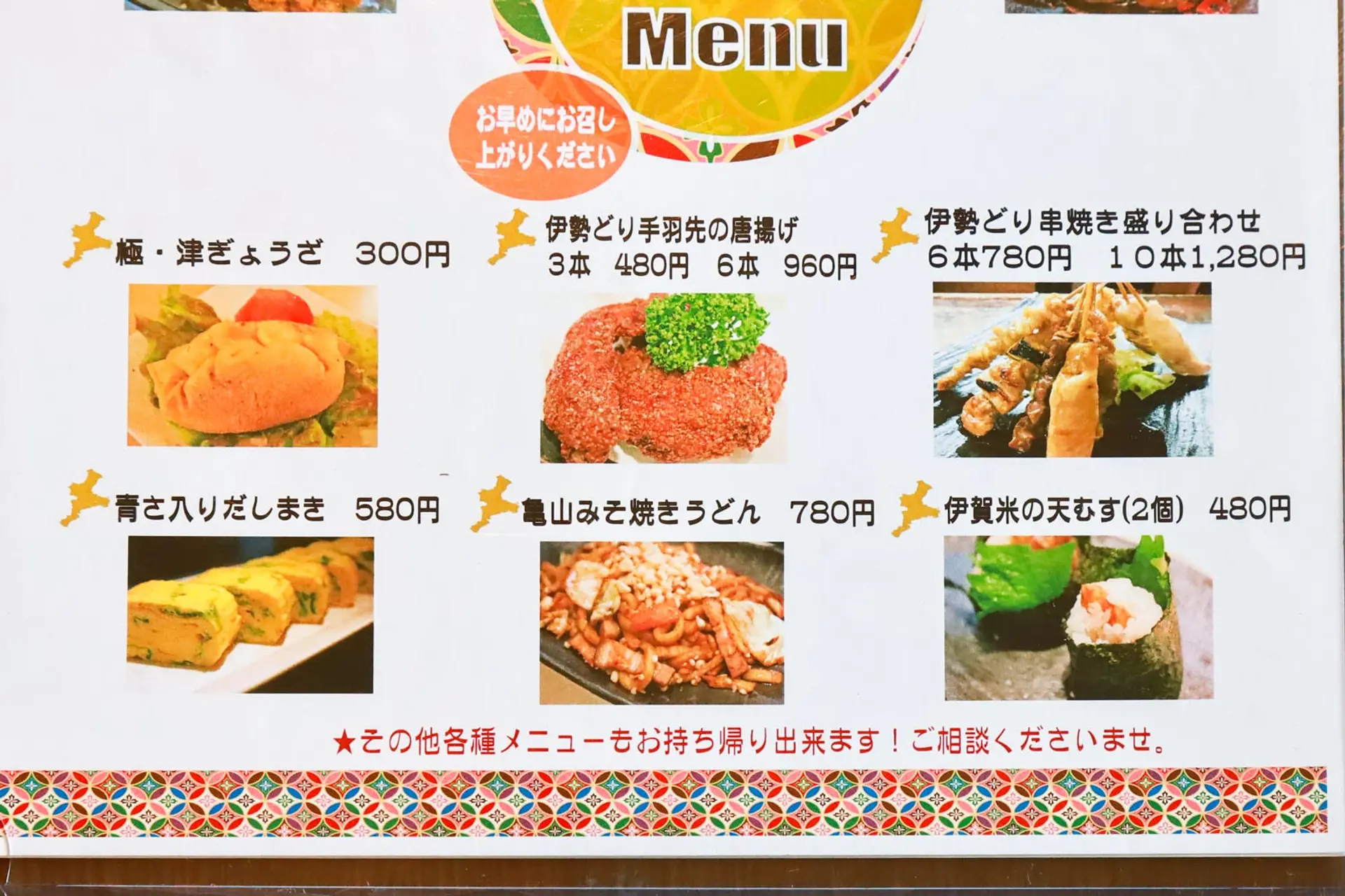 その他のテイクアウトメニューには、伊賀米の天むすや青さ入り出汁巻き卵、亀山みそ焼きうどんなど、お店の美味しい味をおうちで楽しむことができます。