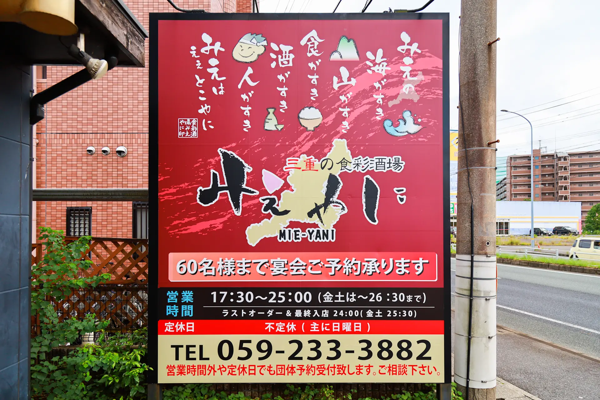 お店の看板には「みえの海がすき、山がすき、酒がすき、人がすき、みえはええとこやに」の文字が描かれており、店名に込められた「三重やに(みえやに)」というコンセプトをお店全体から感じられます。