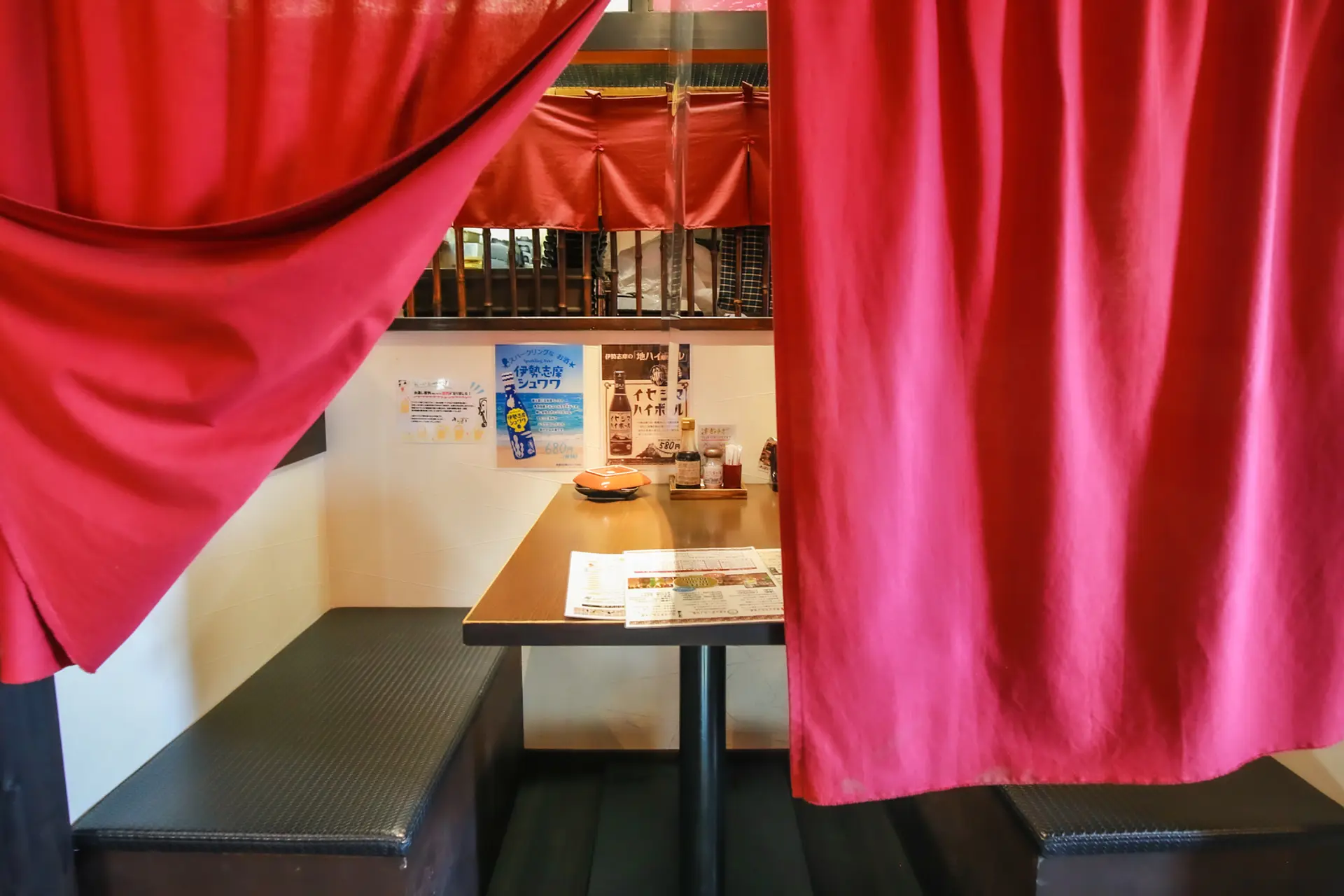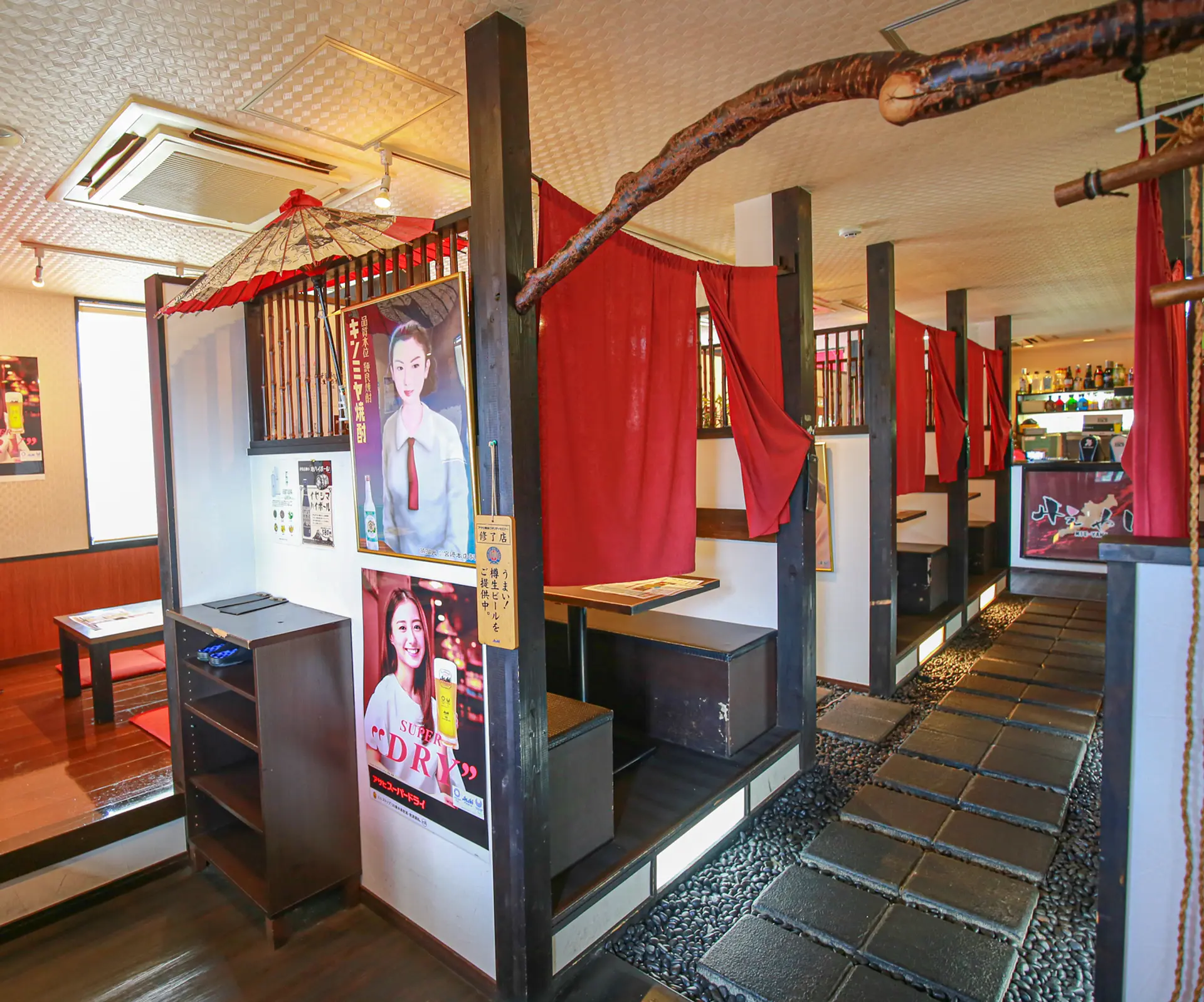テーブル席は松阪木綿の赤い布で仕切られ、石畳の通路は伊勢神宮をイメージした造りになっています。
