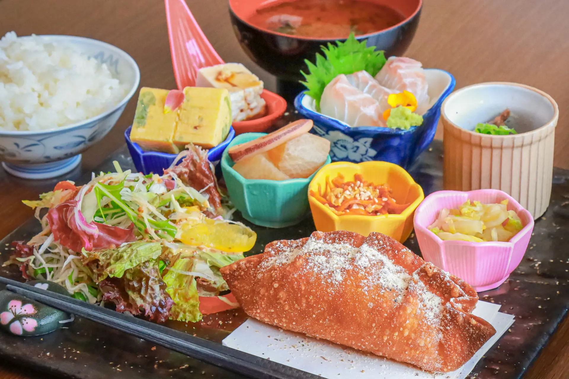 今回の取材では「食彩ランチ 津ぎょうざ」を注文しました。小鉢は日替わりになっており、種類豊富でボリューム満点!