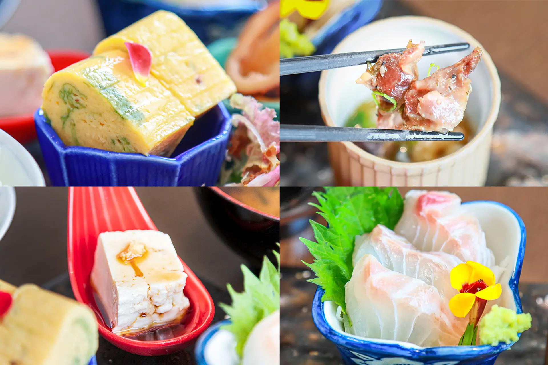 取材日の小鉢には野瀬(のせ)とうふ(※1)の冷奴、三重県産の卵と青さのりを使った出汁巻き卵、三重県産真鯛のお造り、伊勢錦爽(きんそう)どり砂肝のアヒージョがありました。