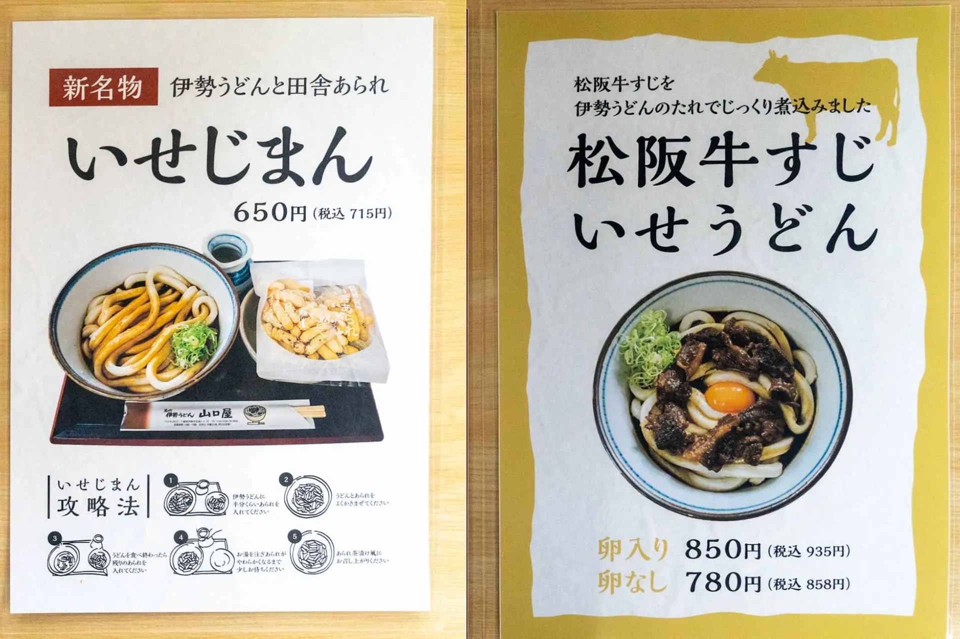 今回は、店主のイチオシである贅沢な「松阪牛すじ伊勢うどん」と新名物の「いせじまん」を注文しました。