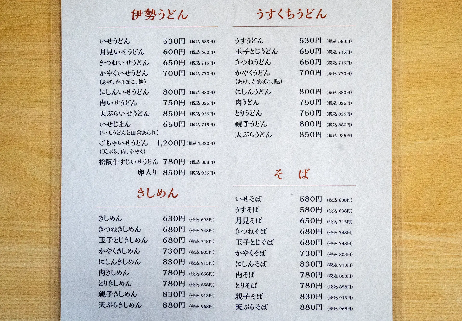 メニューは、自慢の「伊勢うどん」だけでも沢山の種類があり、その他にも「うすくちうどん」や「そば」「きしめん」「カレーうどん」等、選びきれないほど豊富なメニューが用意されています。