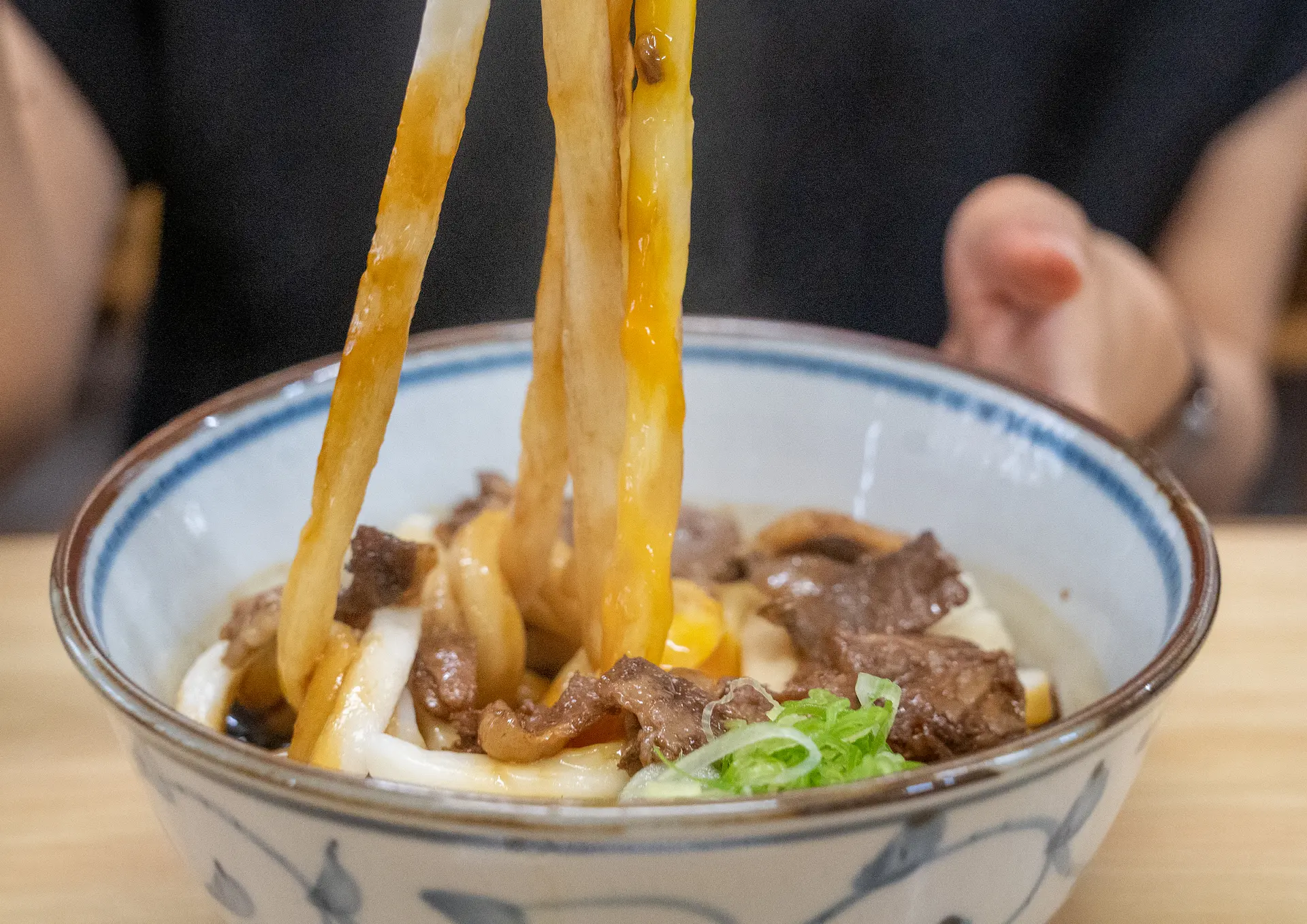 続いて運ばれてきたのは、丹念に煮込まれた松阪牛すじが贅沢にトッピングされた「松阪牛すじ伊勢うどん」。