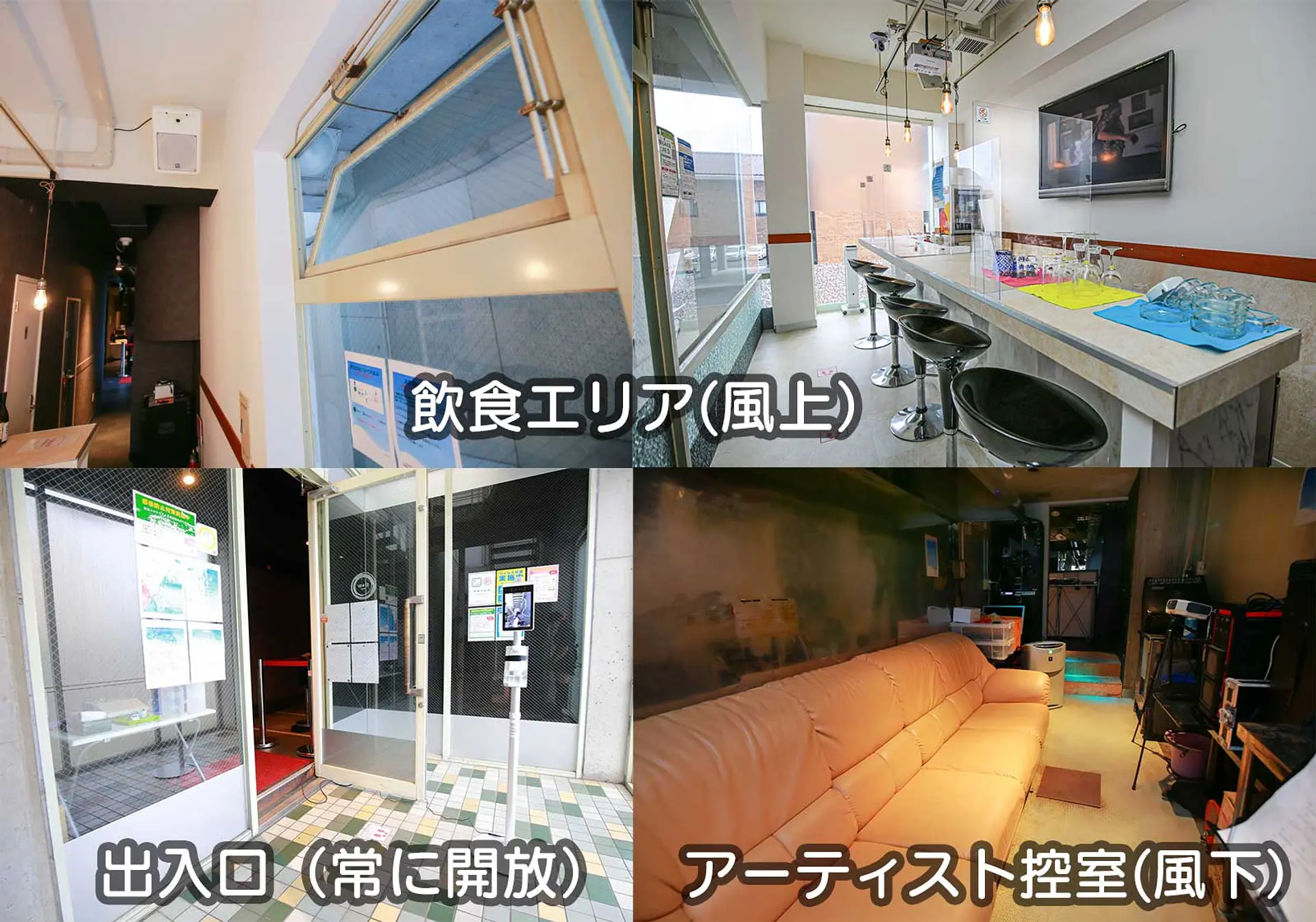 各フロアには換気設備を必ず設け、飲食フロアを風上、アーティスト控室を風下、出入口を常に開放するこで、全フロアに新鮮な空気が行き渡る空気循環を実現しています。