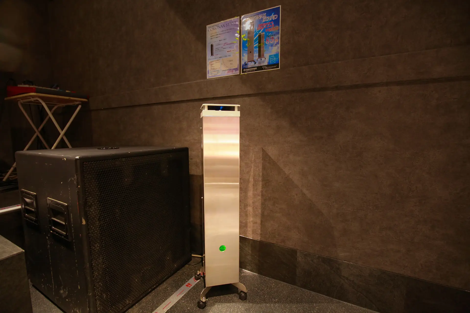 コロナックスの思想を引き継いだ「コロナックスタンド」をライブフロア・飲食フロアに配備。この装置は紫外線の力で空気中の浮遊ウイルスを不活性化し、83%の浮遊殺菌率を実現。