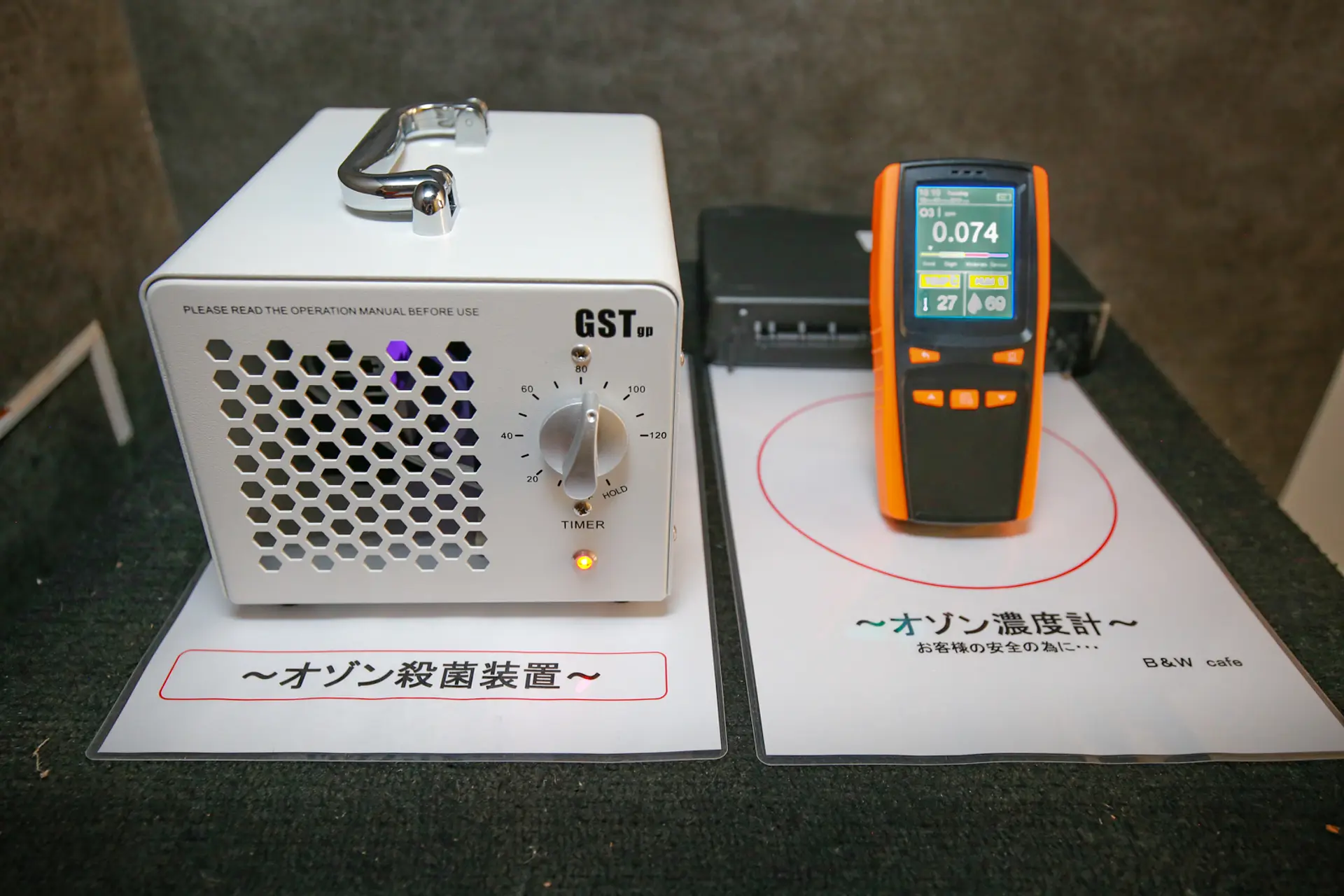 さらに、換気の風上にはオゾン発生装置を配備し、全フロアにオゾンを行き渡らせることで空間除菌の精度を上げています。オゾン濃度が人体の有害にならないように、オゾン濃度計をお客様が確認できる位置に置いています。