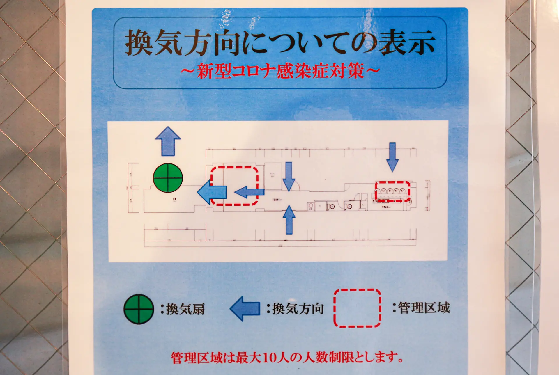 エリアを3つ(飲食・ライブ・アーティスト控室)に分けることで1箇所に空気が滞留しない空間設計になっています。さらに、人々の密集を防ぐため、管理区域では最大10人の人数制限を実施。管理区域の場所は出入口に掲示された「換気方向についての表示」の張り紙で確認できます。