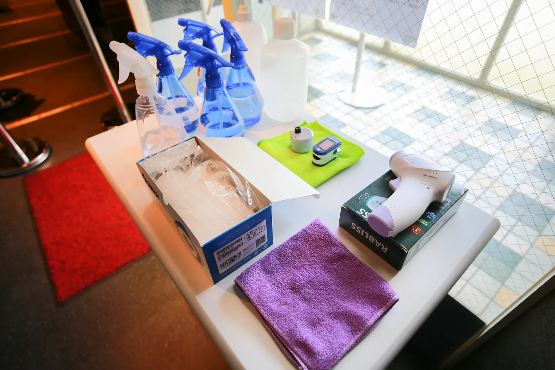 万が一マスクを忘れたり、マスクの紐が破れても大丈夫なように、出入口のテーブルにはマスクが置かれています。