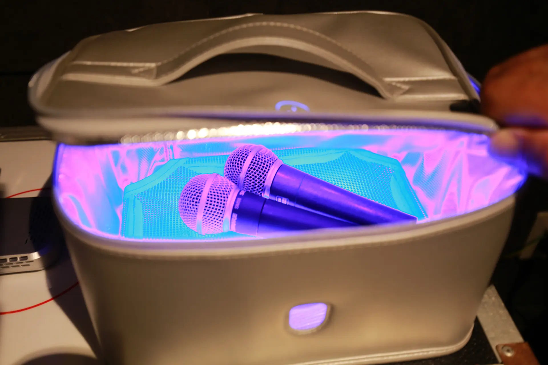 アーティストのマイクは紫外線除菌装置に入っており、ここに3分間入れると除菌可能です。