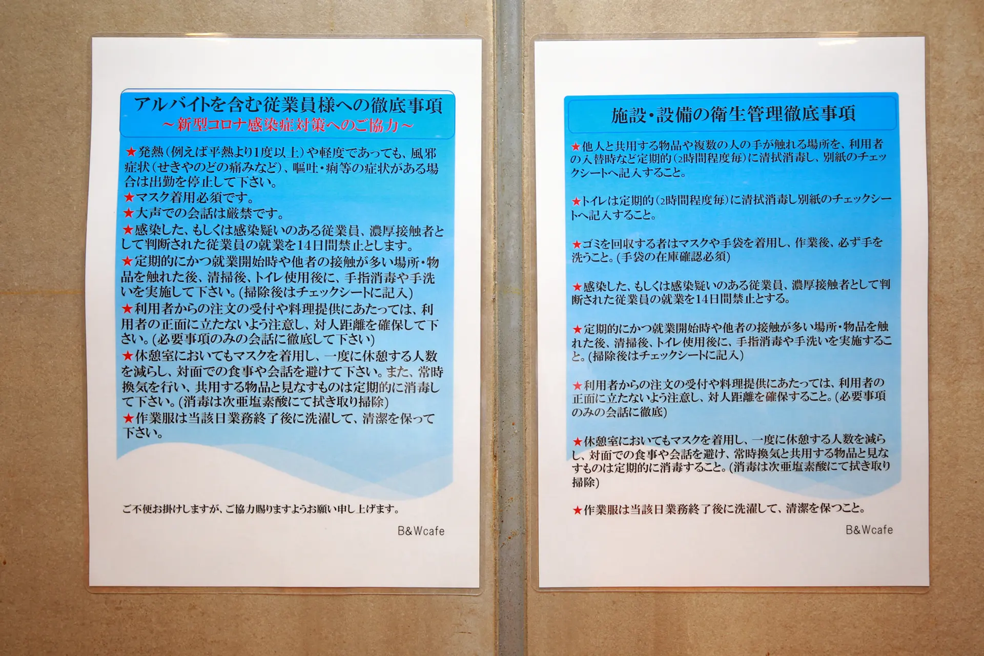 従業員には徹底した感染症対策を指導しており、「アルバイトを含む従業員様への徹底事項」と記載された張り紙が店内各所に掲示されています。