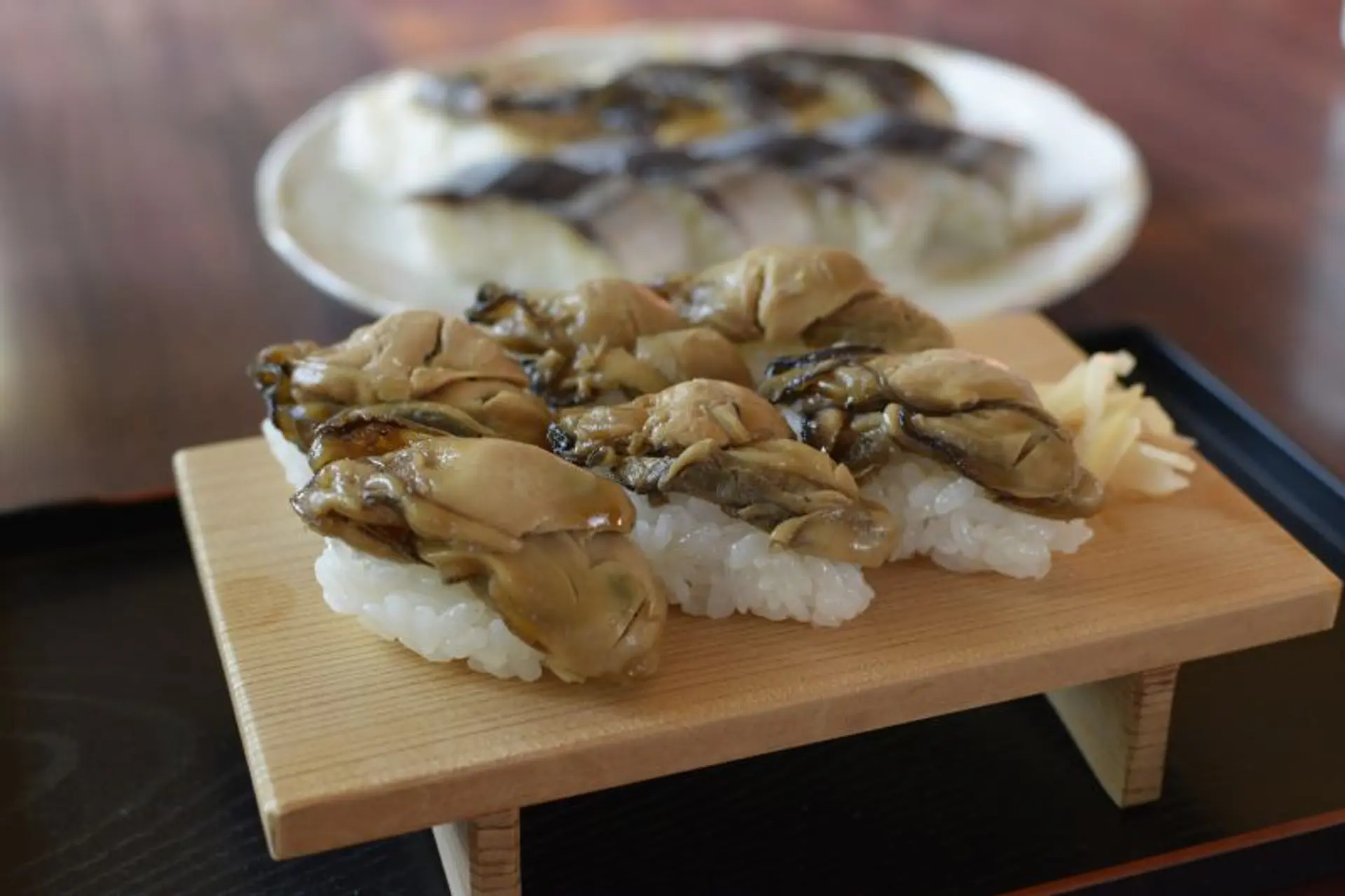 紀北町、紀伊長島駅のすぐ目の前にある「万両寿司」では、幻の牡蠣を使ったこの地の郷土寿司である「渡利かきの握り寿し」が味わえます。