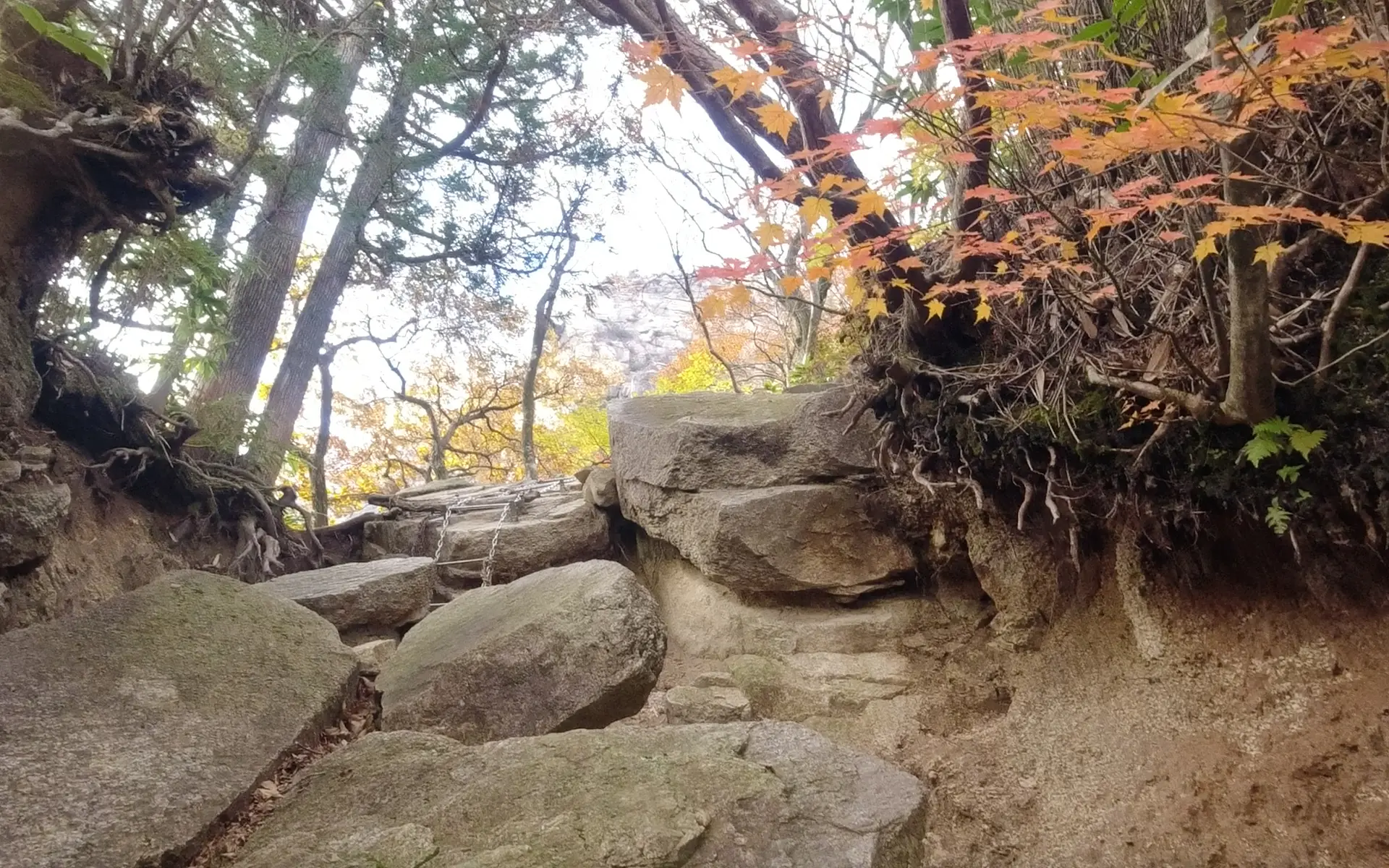 富士見岩から山頂までは遊歩道。紅葉した木々のトンネルを通り、階段を登れば山頂に到着です!