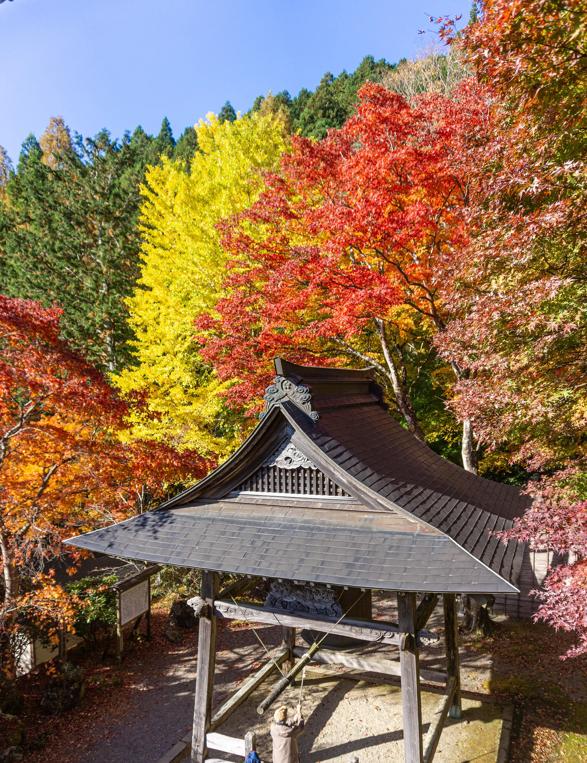 境内全体が綺麗な紅葉で包まれますが、特に県指定文化財でもある八角銅鍾(はっかくどうしょう)の周りが鮮やかに色づいていました。
