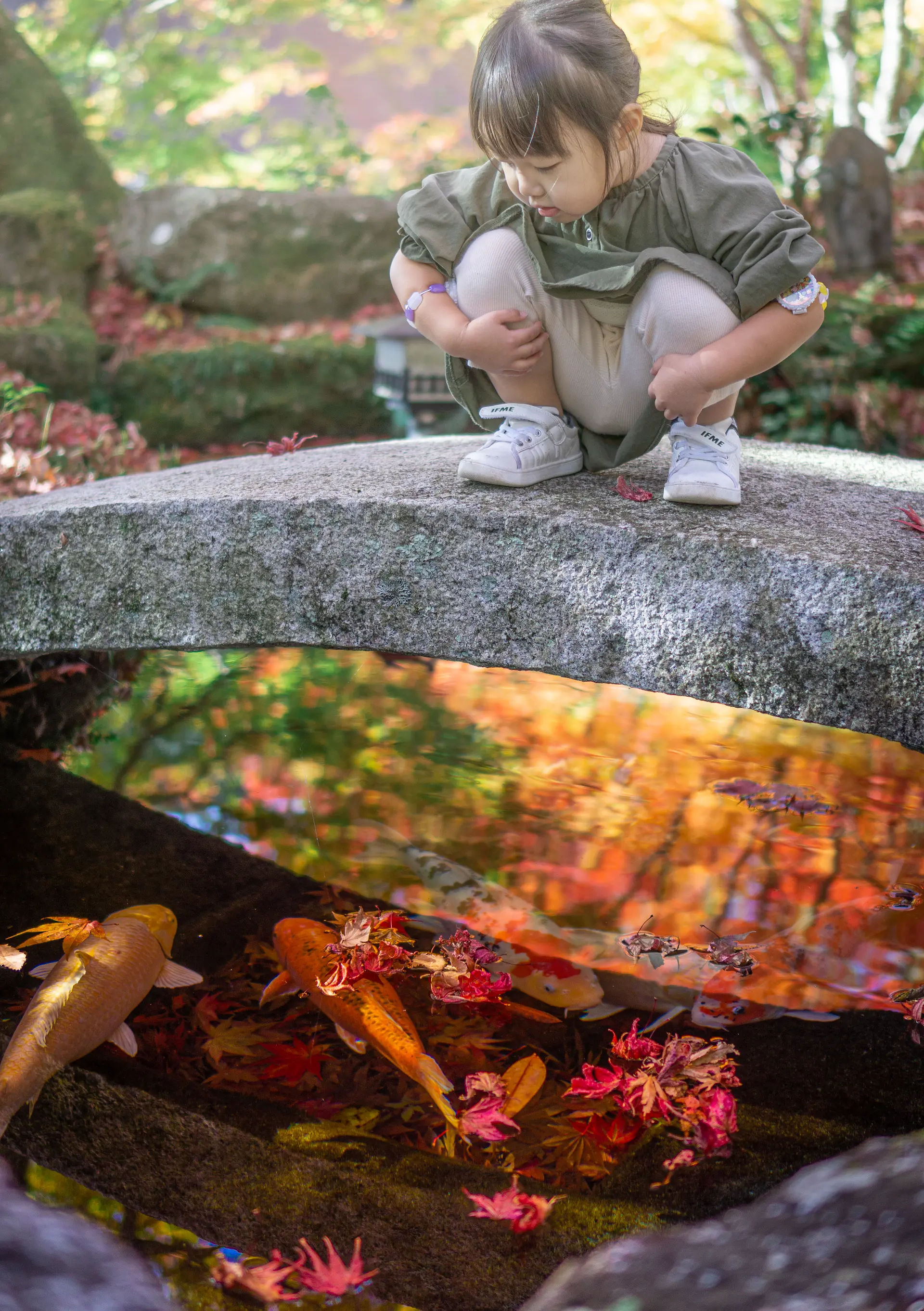 鮮やかに染まった池の中で、鯉が落ち葉をぬって泳ぐ様子は、幻想的なアートの様でした。