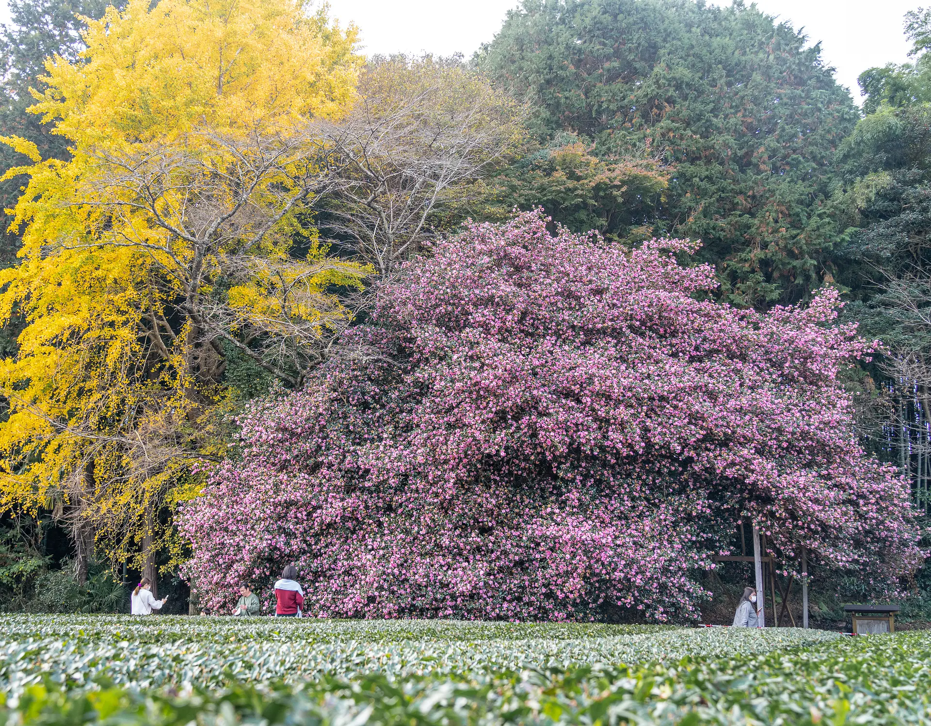 続いてご紹介するのは、飯南町粥見(かゆみ)の茶畑の中で色づく「サザンカの大木」です。