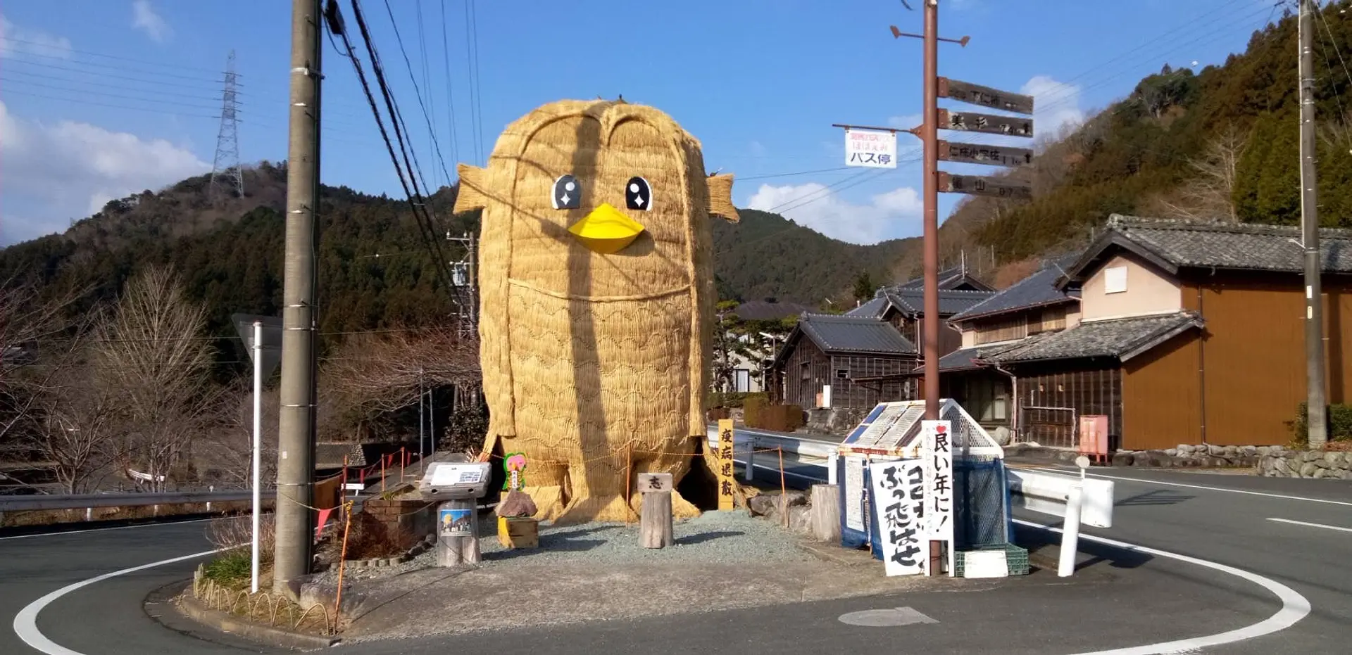 毎年11月中旬頃になると国道368号沿いに現れるこの稲わらのオブジェは、年によって異なる形で作成されています。
