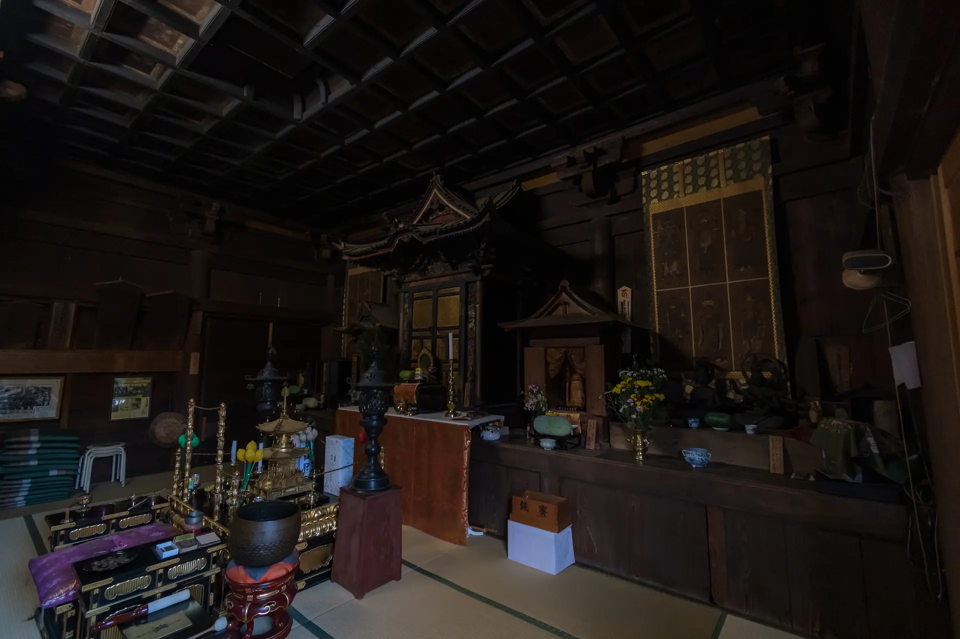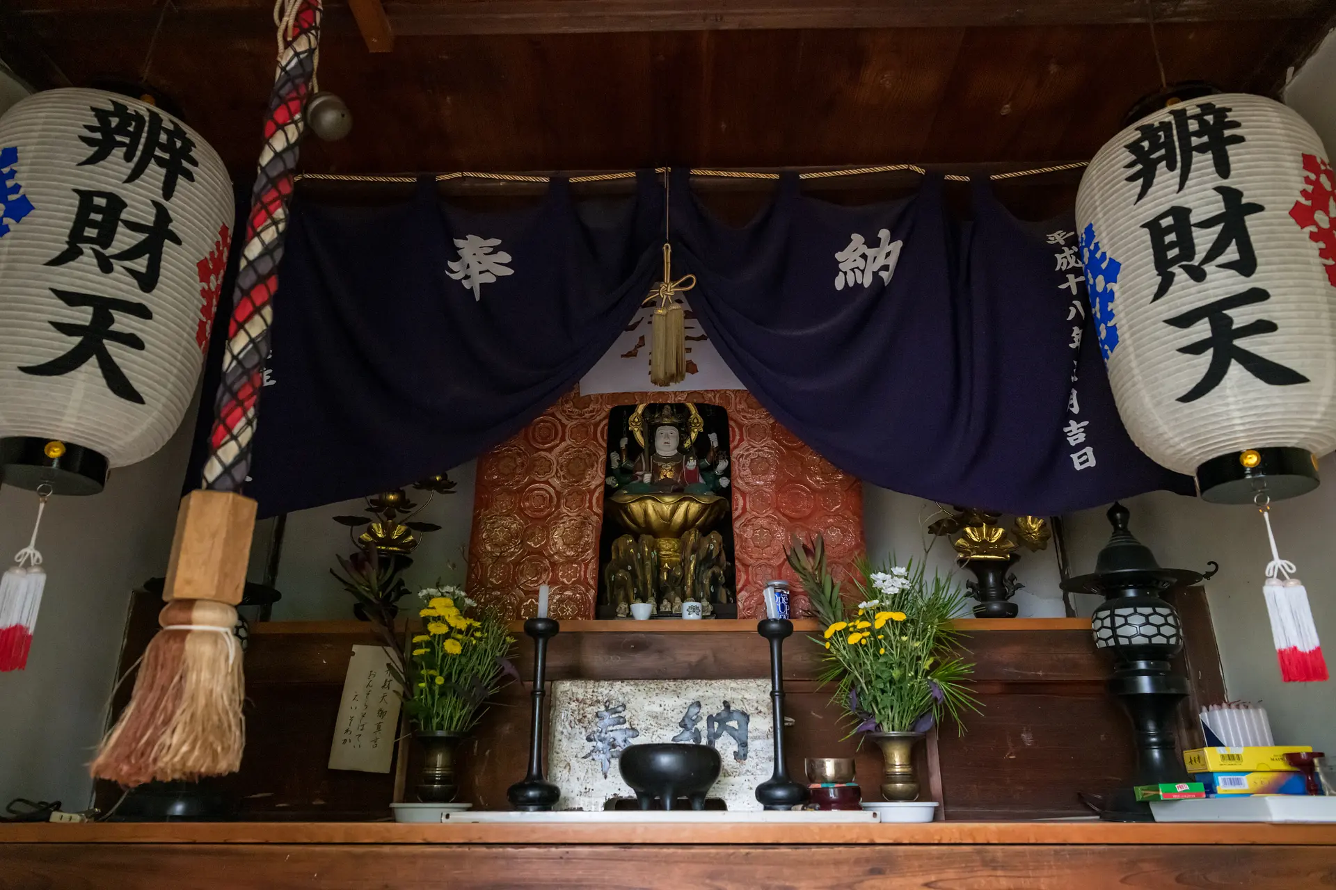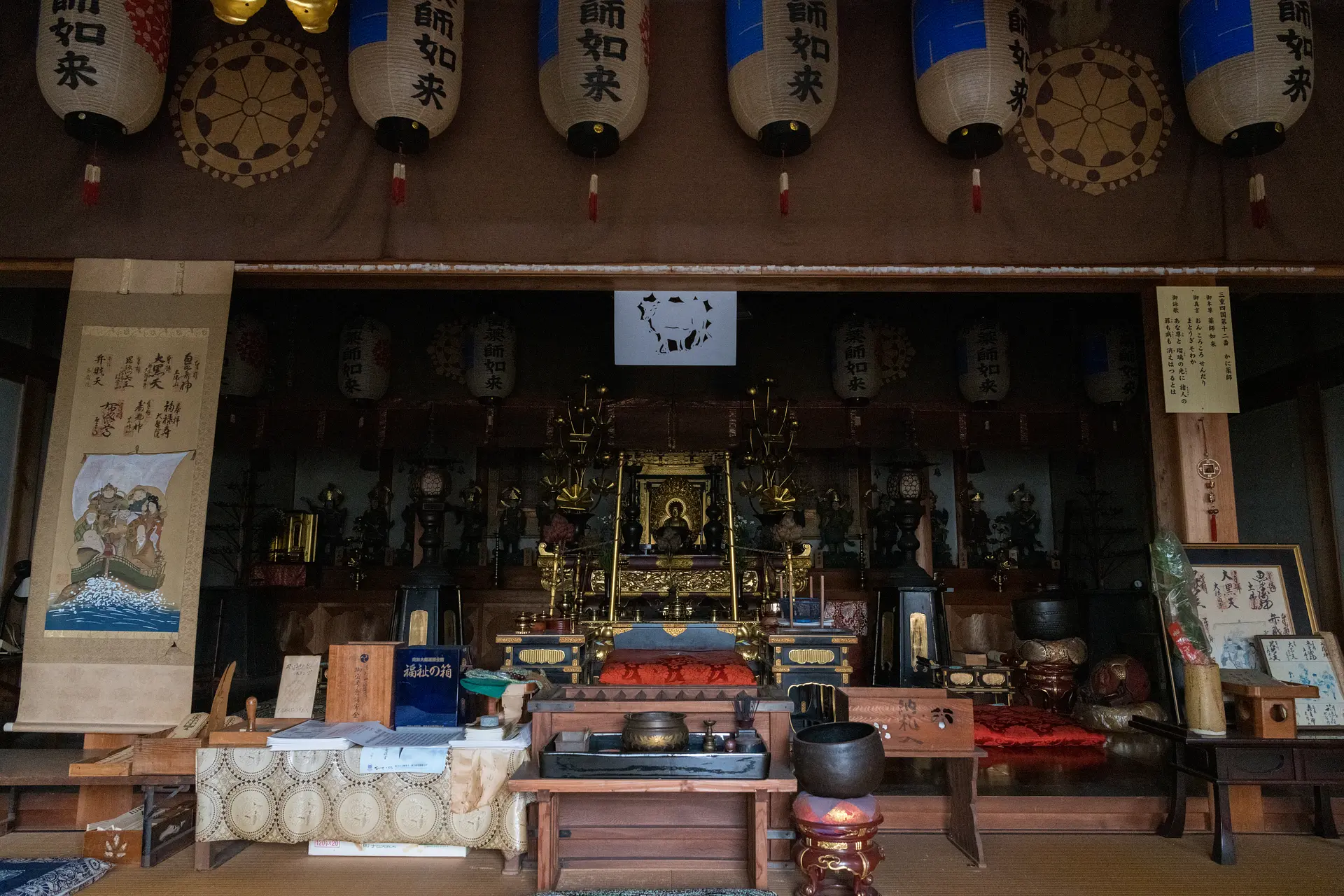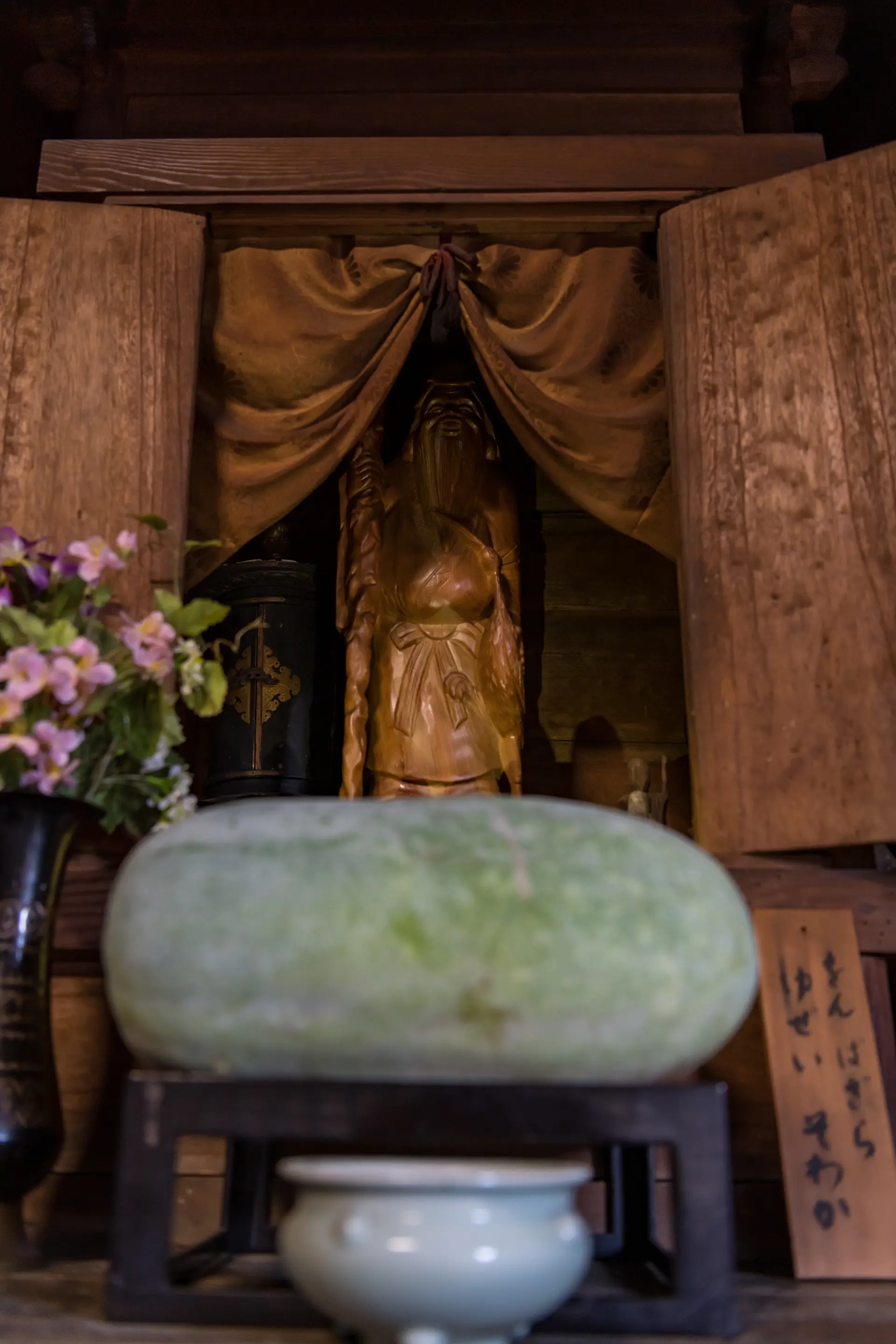 ご本尊様は秘仏となっているため、仏像を背負って来たと云われる蟹の甲殻と一緒に厨子の中で安置されていますが、正面に見える仏様が「御前立(おまえだち)」といって、見えない仏様の代わりにお姿を見せてくれています。
