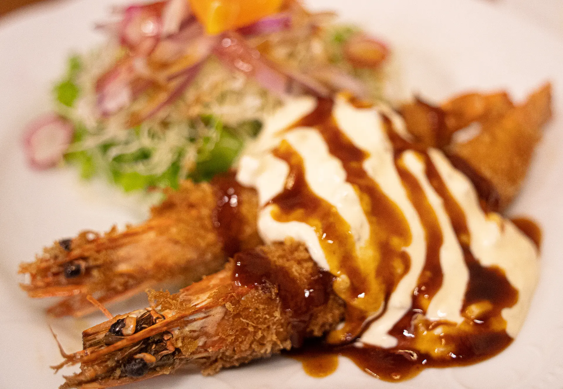 てきたのは、自家製タルタルソースと濃厚なソースがかけられた大きな有頭エビフライ。
