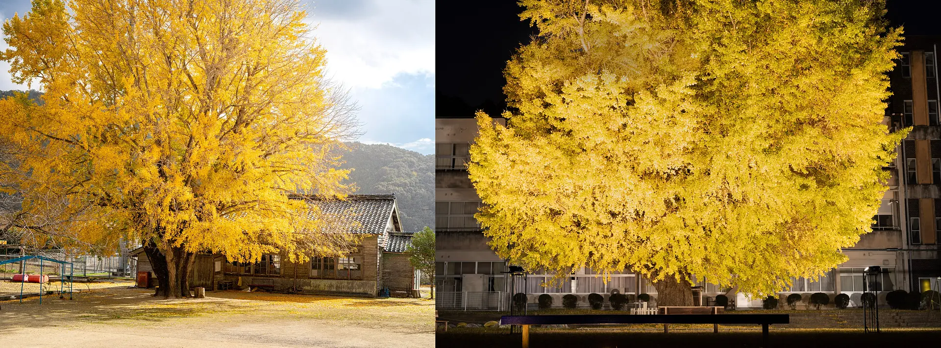 ●閉校となった夜の小学校で行われる大イチョウのライトアップ