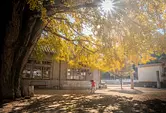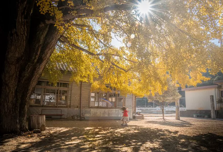 〇趣のある古い木造校舎の横にそびえる「河内の大イチョウ」