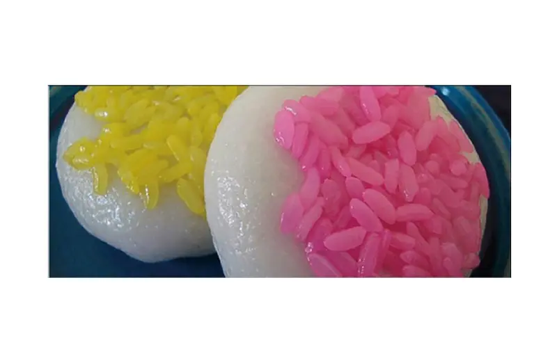 もち米を完全につかずに粒を残した状態でもちを作り、中にこしあんを入れたもの。程良い米粒の歯ざわりもまたおいしい。