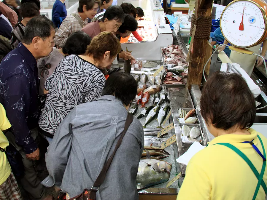魚市場の活気が満ちる尾鷲の名物市です。鮮魚や干物、野菜、果物、惣菜、菓子など、尾鷲ならではの逸品を特別価格で販売します。その場で発送も可能なので、遠方の方も安心です。