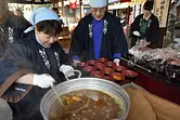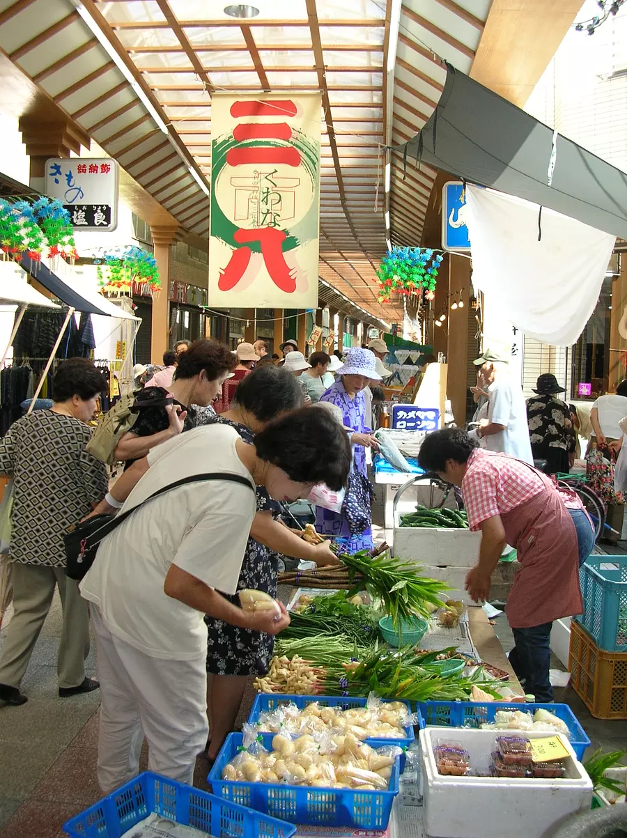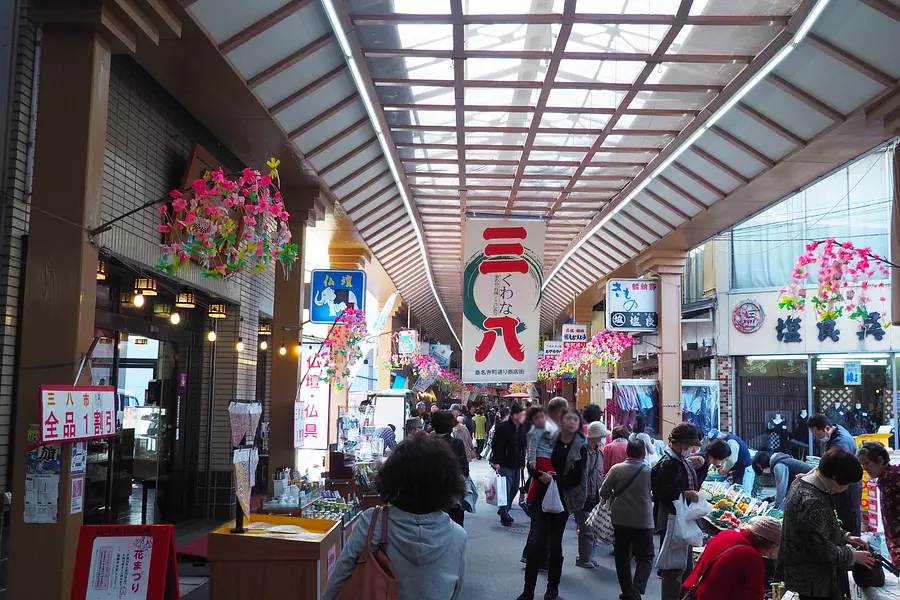 桑名市の中心市街地にある寺町通り商店街アーケードで行われている朝市。毎月3と8のつく日に開催される、東海地方有数の朝市。地元だけでなく、遠方からの固定ファンも多く、毎回1万人を超える買い物客で賑わいます。市には、近隣の農家や露天商などが出店し、新鮮な野菜、果物、海産物などを格安で販売しています。※1/3は休み