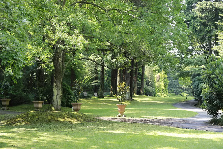 シャクナゲを中心に約1,000品種、1万本以上の花木を楽しむことができる里山です。広さ約60,000㎡の園内には、世界一のっぽの木と呼ばれるセンペルセコイヤの大木が育ち、野山をかけめぐる「森のエリア」と、ローズガーデンやスイレンの咲く池が魅力の「花のエリア」があり、季節折々の大自然の恵みを感じることができます。