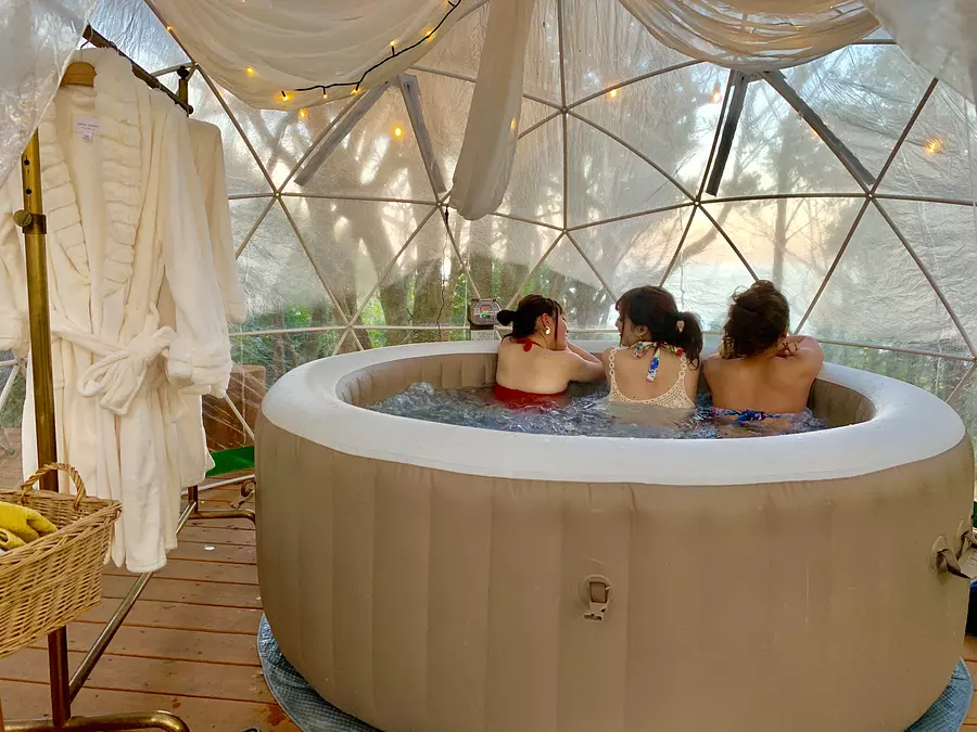 フィンランド式ロウリュサウナとジャグジー付きの新グランピングプランでは、日常生活から離れ解放感を味わえます。