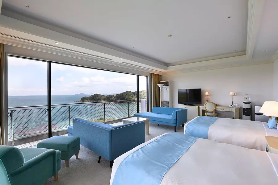 宿泊施設はツインルームとスイートルームの2タイプをご用意しております。岬の先端の展望レストランでのお食事も楽しみのひとつ。
