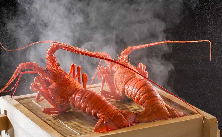 一切冷凍伊勢海老を使わず、すべて生簀からの活造りにこだわって提供しています。逃げ出しそうなほど活きの良い伊勢海老をせいろにのせ、テープルの蒸し器で蒸しあげる『伊勢海老姿蒸し(5,500円~)』はこのお店の名物。