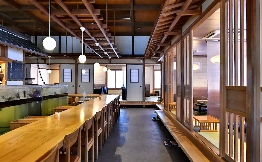 回漕問屋をイメージした間口の広い建物が特徴の料理店「海老丸」。囲炉裏・車箪笥・船徳利などが置いてありまるで漁師の家に上がりこんだようなお座敷席や、料理人との会話が楽しめるカウンター席、大人数でも楽しめるテーブル席と広い店内。