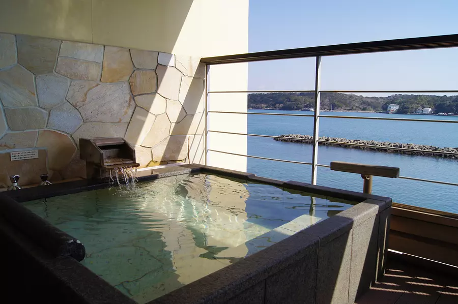 海女の里・石鏡の伊勢湾を一望する高台に建つホテル。伊勢湾や伊良湖岬、神島が一望でき、冬の晴れた日には遠く富士山や御岳が見えることも。絶景露天風呂と貸切家族風呂が大好評です。