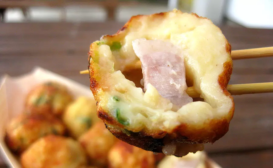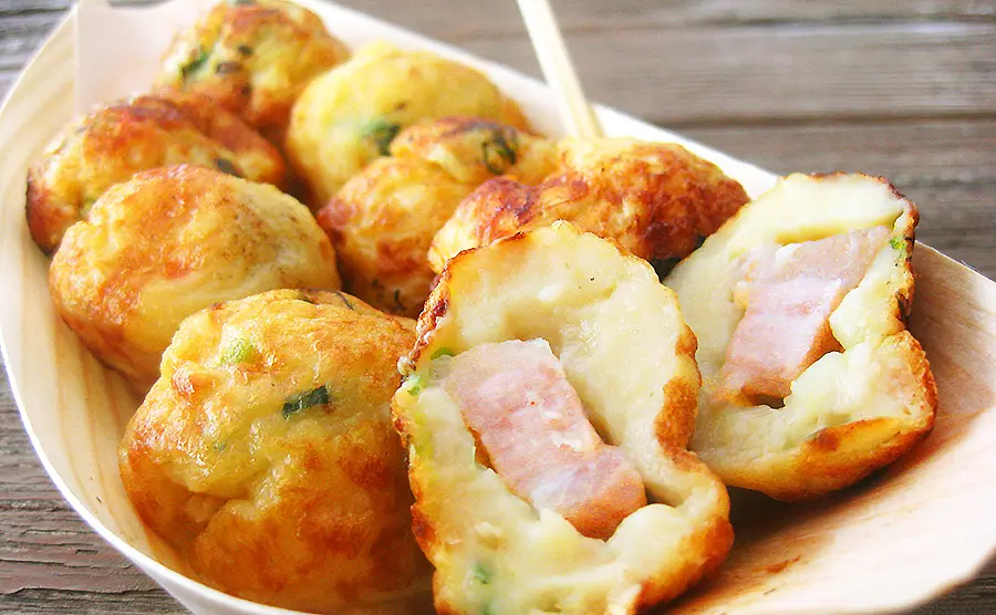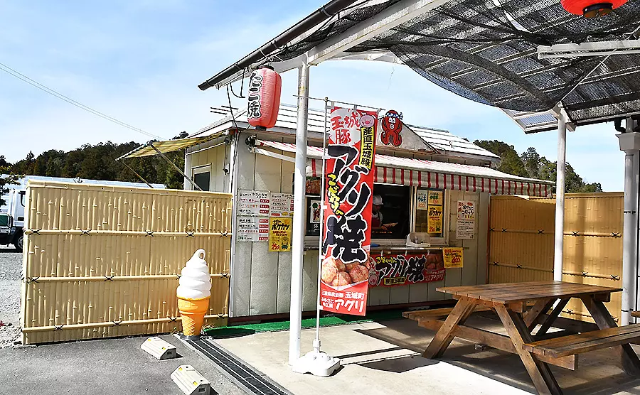ここで食べることが出来るたこ焼きのようなおやつが『アグリ焼き』。元々はたこ焼きの屋台をやろうと思ったそうだが、海の無い地域の産直が海のものを売っていいのか?という思いもあり、地元の名産品である玉城豚を入れることに。豚肉にあう生地にするため、出汁作りからスタート。大阪のたこ焼屋で実際に焼いてもらい、試食を重ね完成した『アグリ焼き』は、たこ焼きの本場の職人が「これは旨い!」と認める味。
