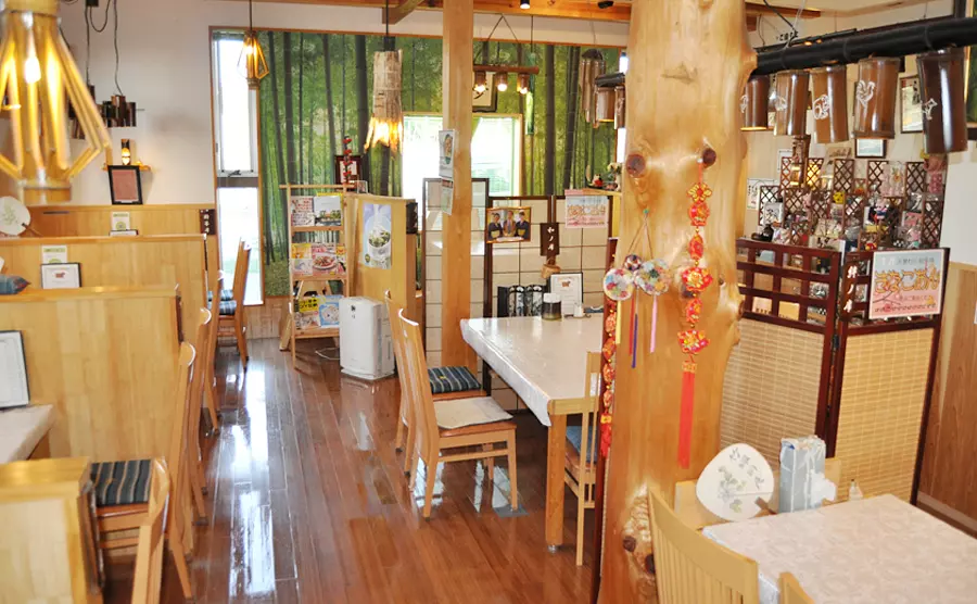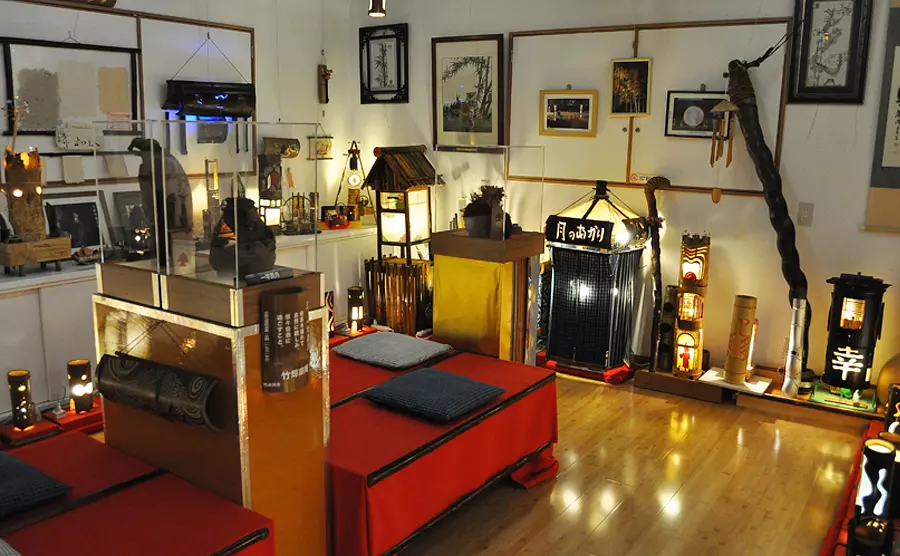 店内は床やテーブル・照明までも竹で作られていて、照明や箸立てはご主人の手作り。松阪の工芸品や竹細工・様々な手作り作品が並ぶ「まちかど博物館」も併設されています。
