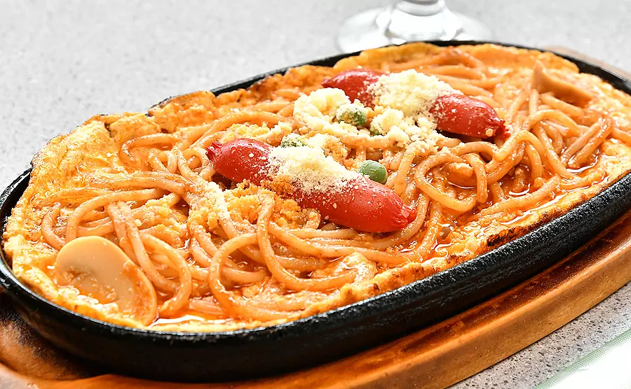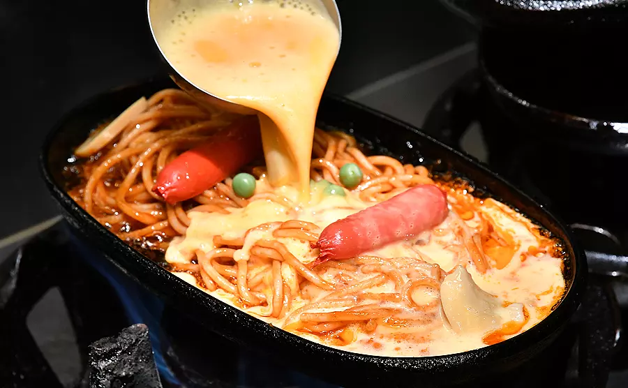 詳細は企業秘密だが、様々な材料を独自の配合で混ぜ合わせたオリジナルのケチャップで味付けしたナポリタンを熱々の鉄板にのせ、溶き卵を流し込む。南部鉄器の鉄板を使用しているのも喫茶モリのこだわり。