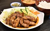 三重県産の良質な豚肉の肩ロースを1人前250g。良いものを提供するため、大トンテキ用は1本から4人前しか取らないと言うこだわりよう。食材を無駄にしてはいけないと残りの部分は『こま切れ焼き』や『塩てき』など、大とんてきとは違う味で楽しんでいただけるよう常に研究を重ねています。