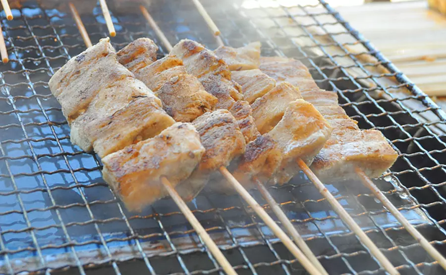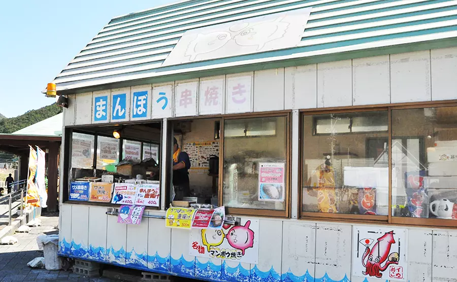 ゆら~りとおちゃめな姿で泳ぐマンボウは、実は鮮度が落ちやすいため地元でしか味わえません。土曜日と日曜日、そして祝日だけオープンするマンボウ屋台では焼き立ての串焼きを販売しています。またマンボウ以外にも、『シュモクザメの串焼き』も販売中。